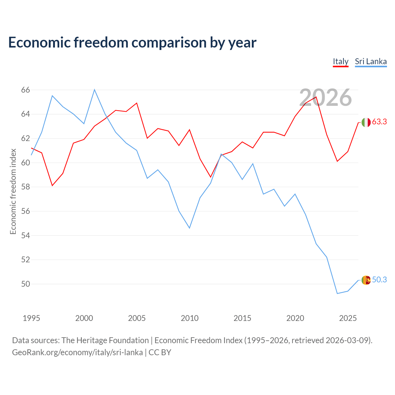 The Economic Freedom Index for Italy is 63.3, ranking 80/197, compared to 50.3 for Sri Lanka, ranking 162/197. The chart above displays a comparison of annual changes in economic freedom indexes.