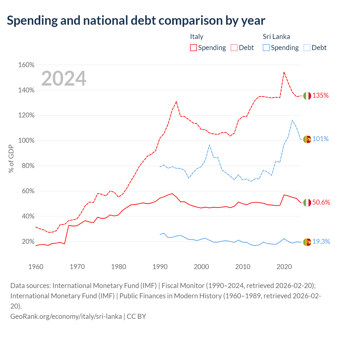 Italy has $3.22T in government debt (135.3% of GDP), compared to $99.8B (100.8% of GDP) in Sri Lanka.
