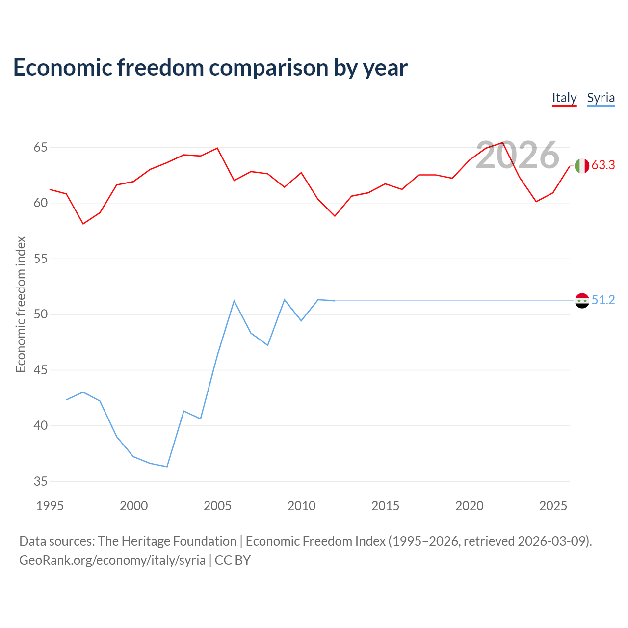 The Economic Freedom Index for Italy is 63.3, ranking 80/197, compared to 51.2 for Syria, ranking 155/197. The chart above displays a comparison of annual changes in economic freedom indexes.