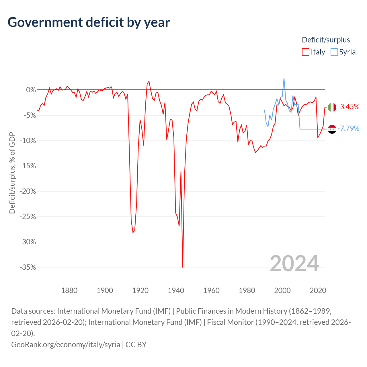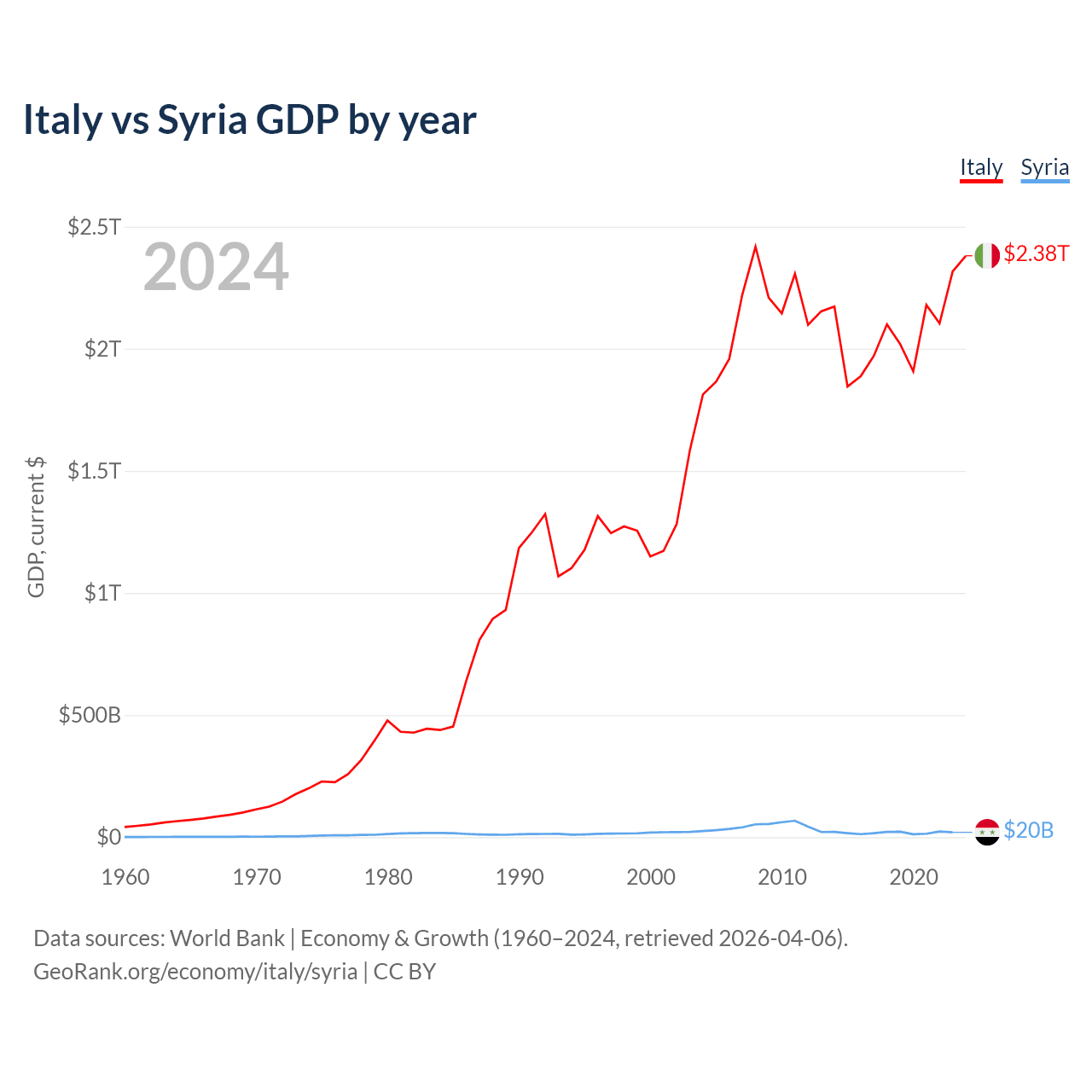 Italy has a GDP of $2.38T compared to $20B for Syria, ranking 8/197 and 129/197 by economy size, respectively.