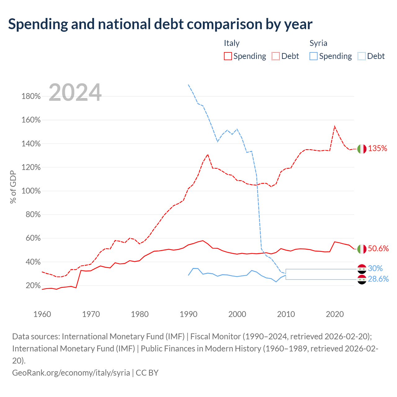 Italy has $3.22T in government debt (135.3% of GDP), compared to $18.4B (30% of GDP) in Syria.