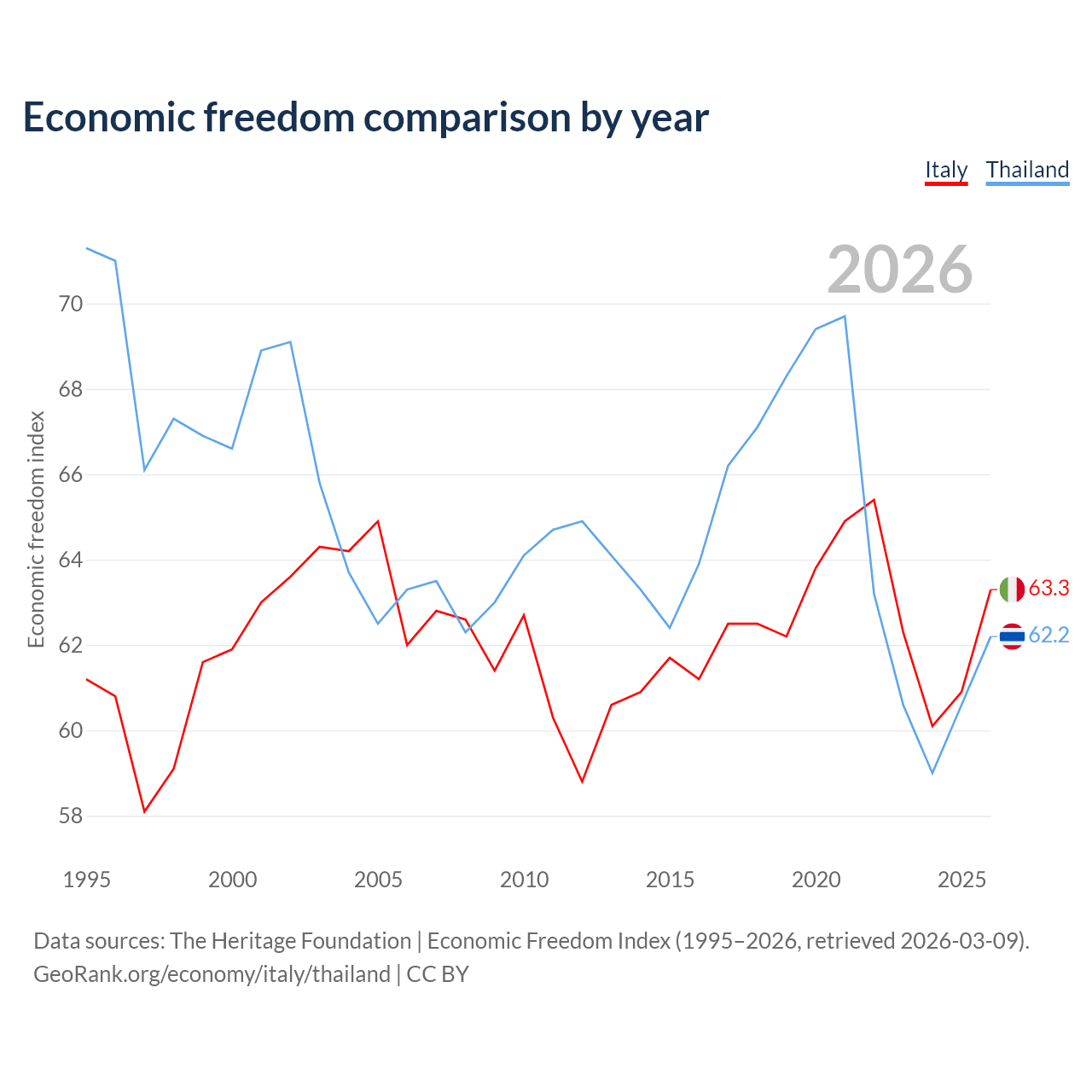 Data sources: The Heritage Foundation | Economic Freedom Index (1995–2026, retrieved 2026-03-09).