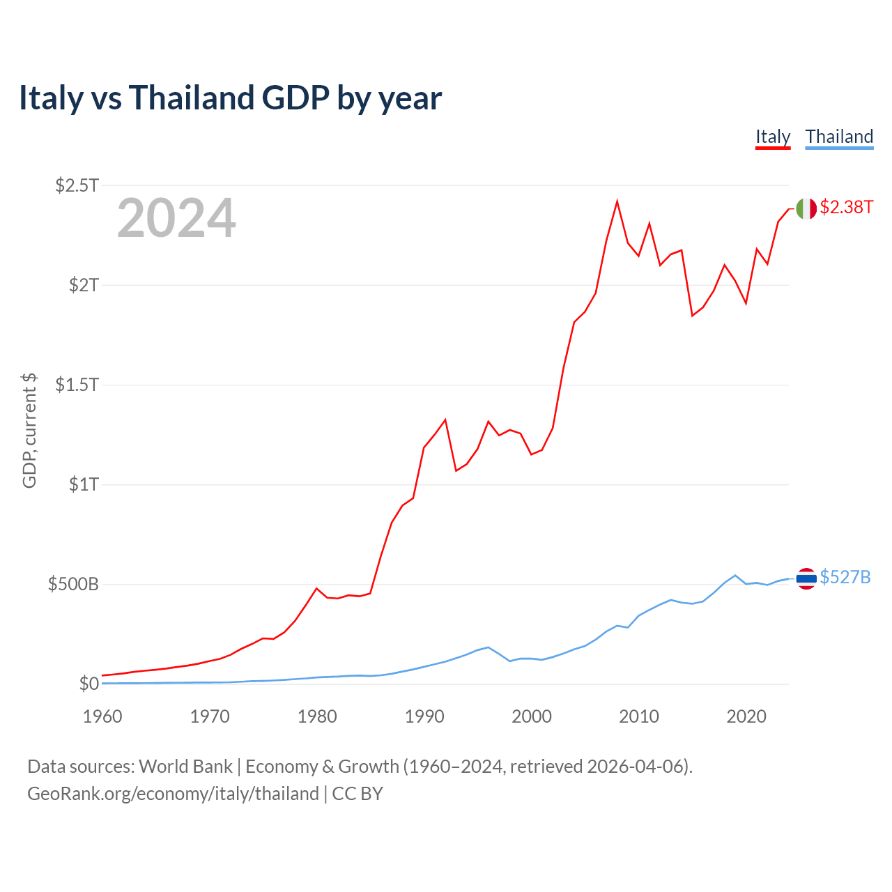 Italy has a GDP of $2.38T compared to $527B for Thailand, ranking 8/197 and 31/197 by economy size, respectively.