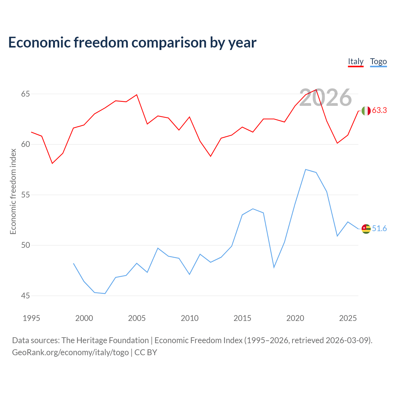 The Economic Freedom Index for Italy is 63.3, ranking 80/197, compared to 51.6 for Togo, ranking 153/197. The chart above displays a comparison of annual changes in economic freedom indexes.
