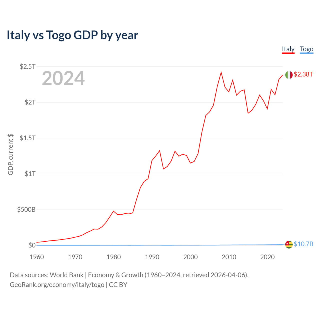 Italy has a GDP of $2.38T compared to $10.7B for Togo, ranking 8/197 and 154/197 by economy size, respectively.