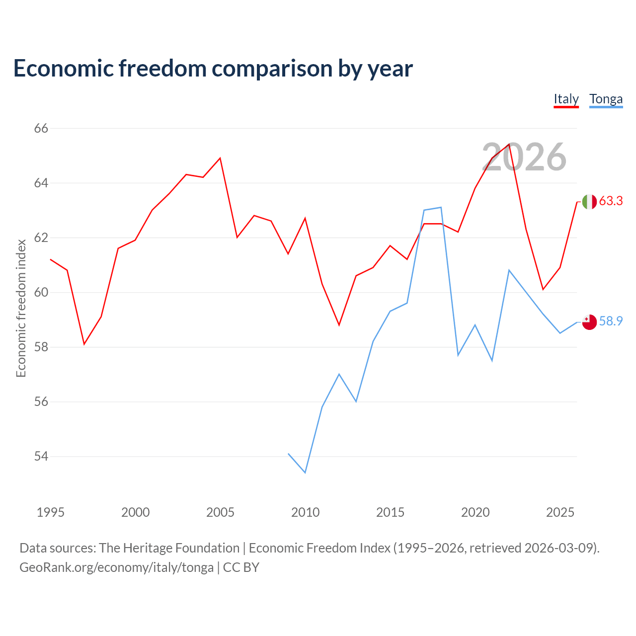 The Economic Freedom Index for Italy is 63.3, ranking 80/197, compared to 58.9 for Tonga, ranking 107/197. The chart above displays a comparison of annual changes in economic freedom indexes.