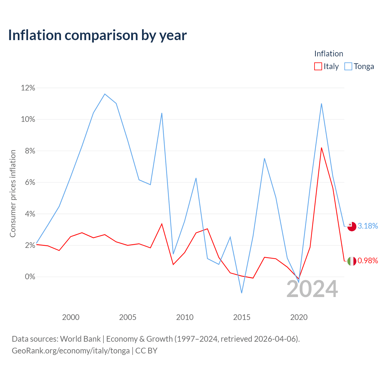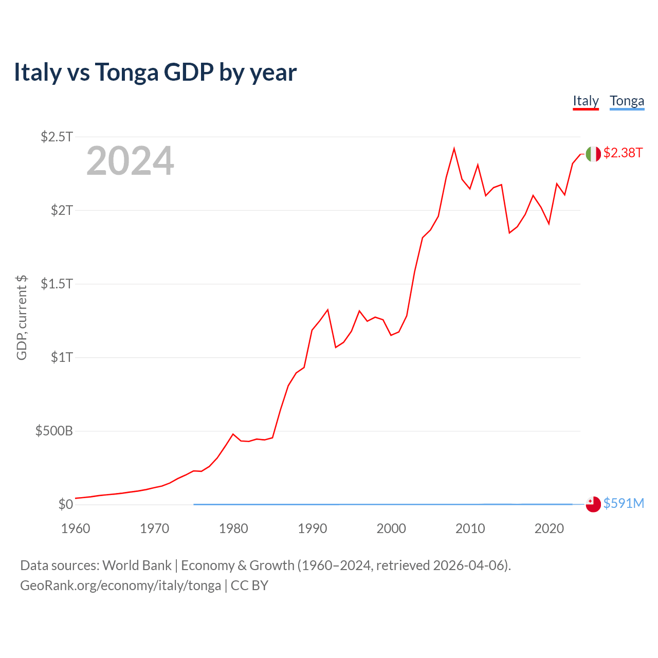 Italy has a GDP of $2.38T compared to $591M for Tonga, ranking 8/197 and 191/197 by economy size, respectively.