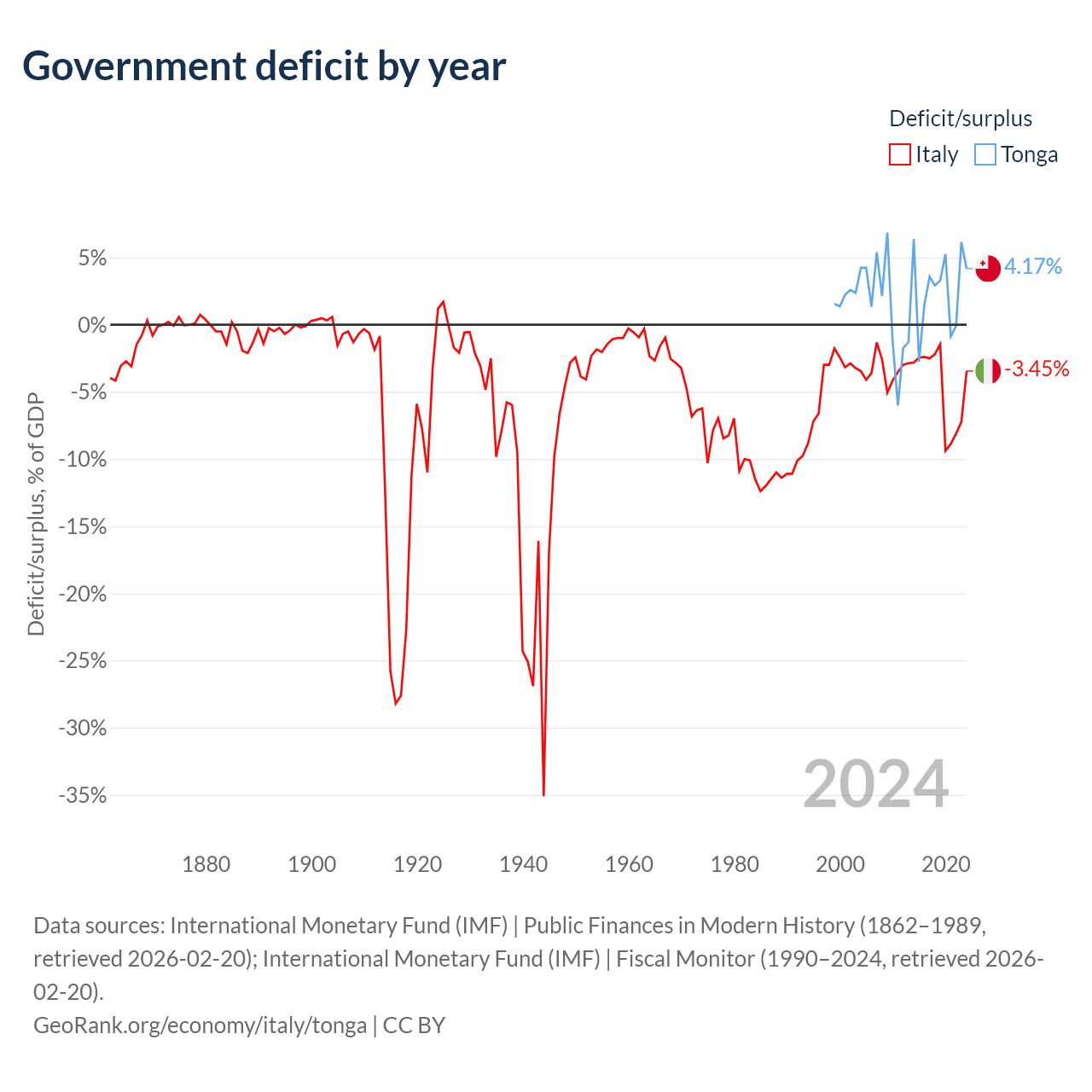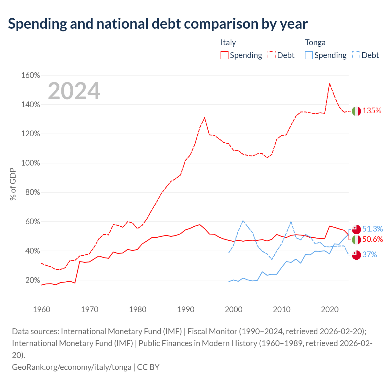Italy has $3.22T in government debt (135.3% of GDP), compared to $256M (37% of GDP) in Tonga.