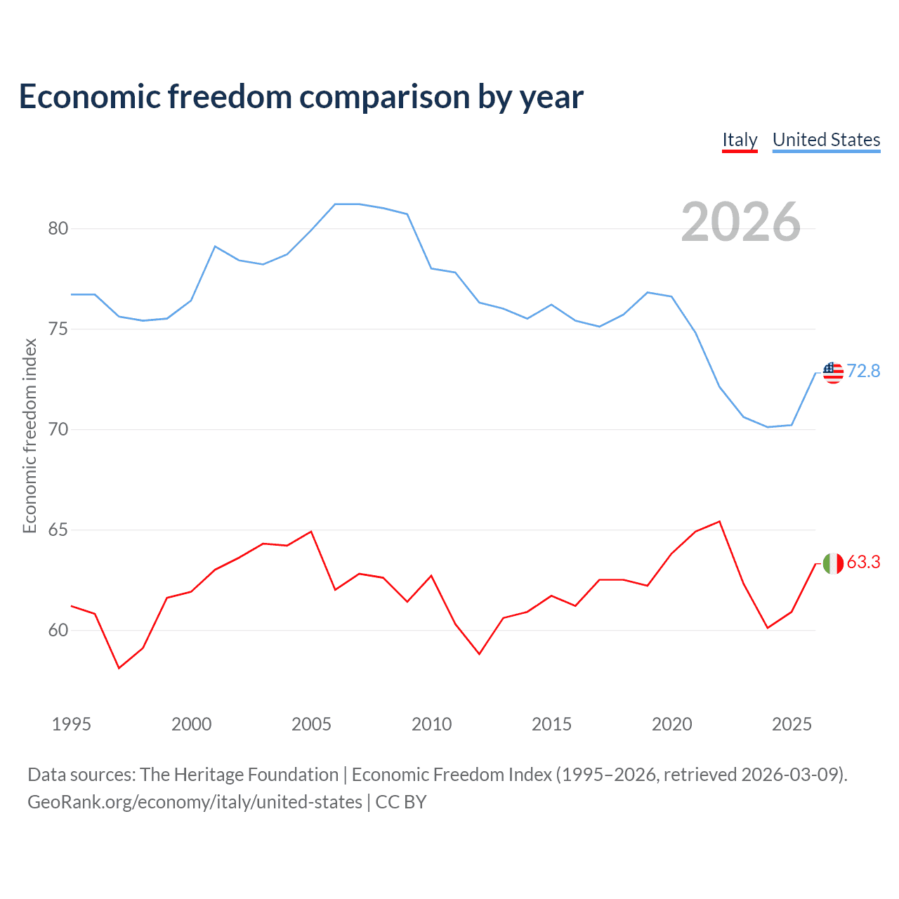 Data sources: The Heritage Foundation | Economic Freedom Index (1995–2026, retrieved 2026-03-09).