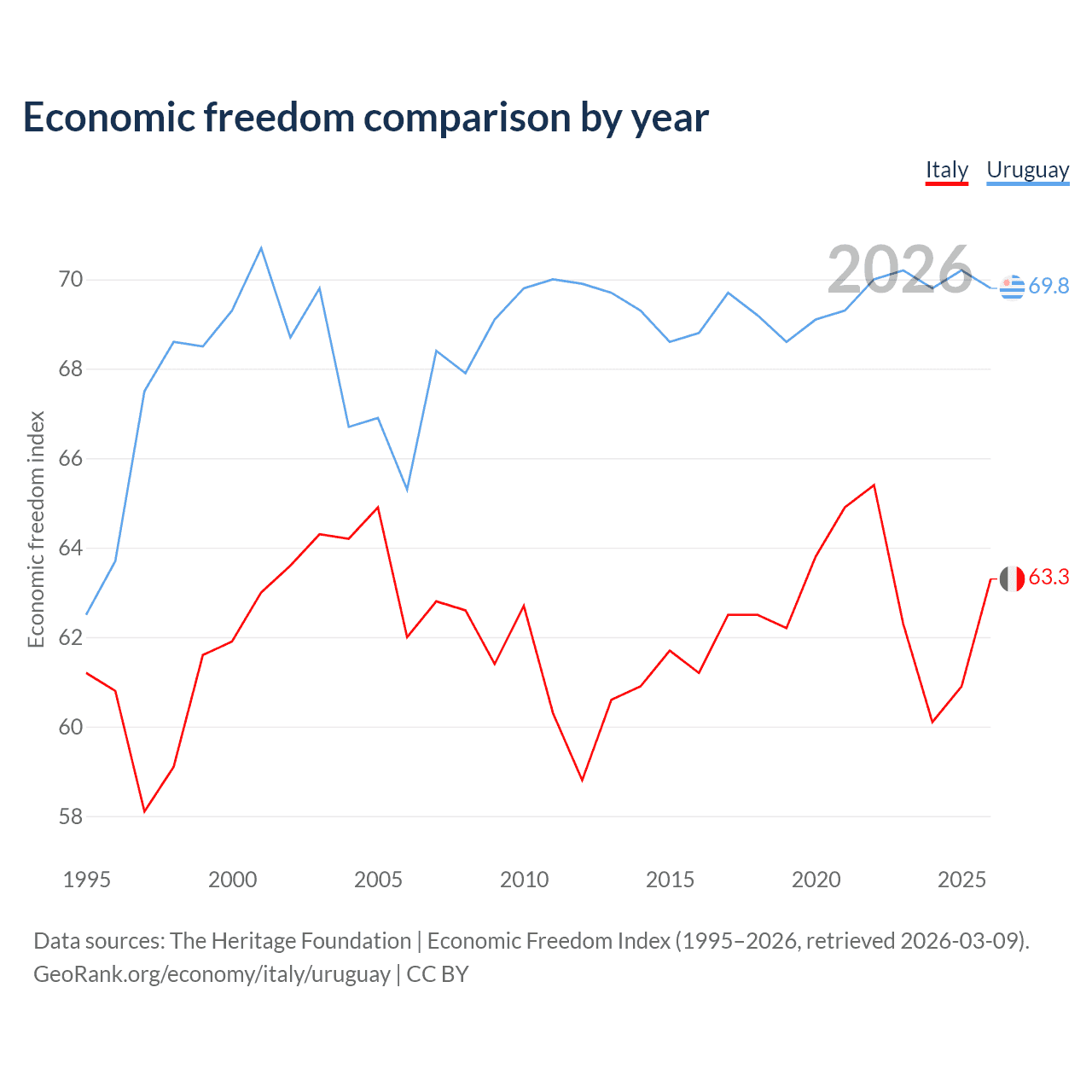 The Economic Freedom Index for Italy is 60.9, ranking 89/197, compared to 70.2 for Uruguay, ranking 35/197. The chart below displays a comparison of annual changes in economic freedom indexes.