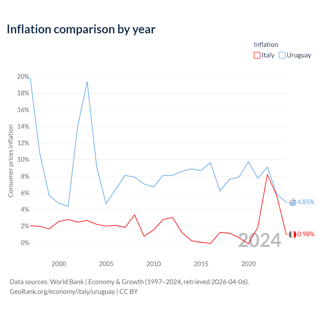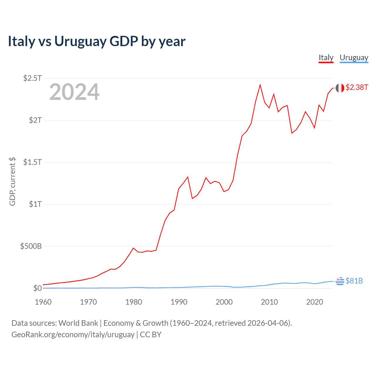 Italy has a GDP of $2.38T compared to $81B for Uruguay, ranking 8/197 and 81/197 by economy size, respectively.