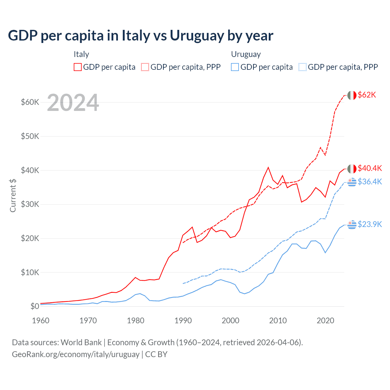 The chart below compares the two countries' GDP growth in both current (nominal) and constant dollars, accounting for inflation over time.
