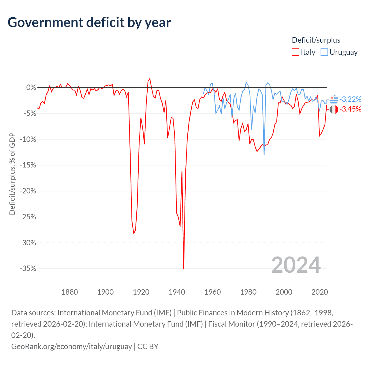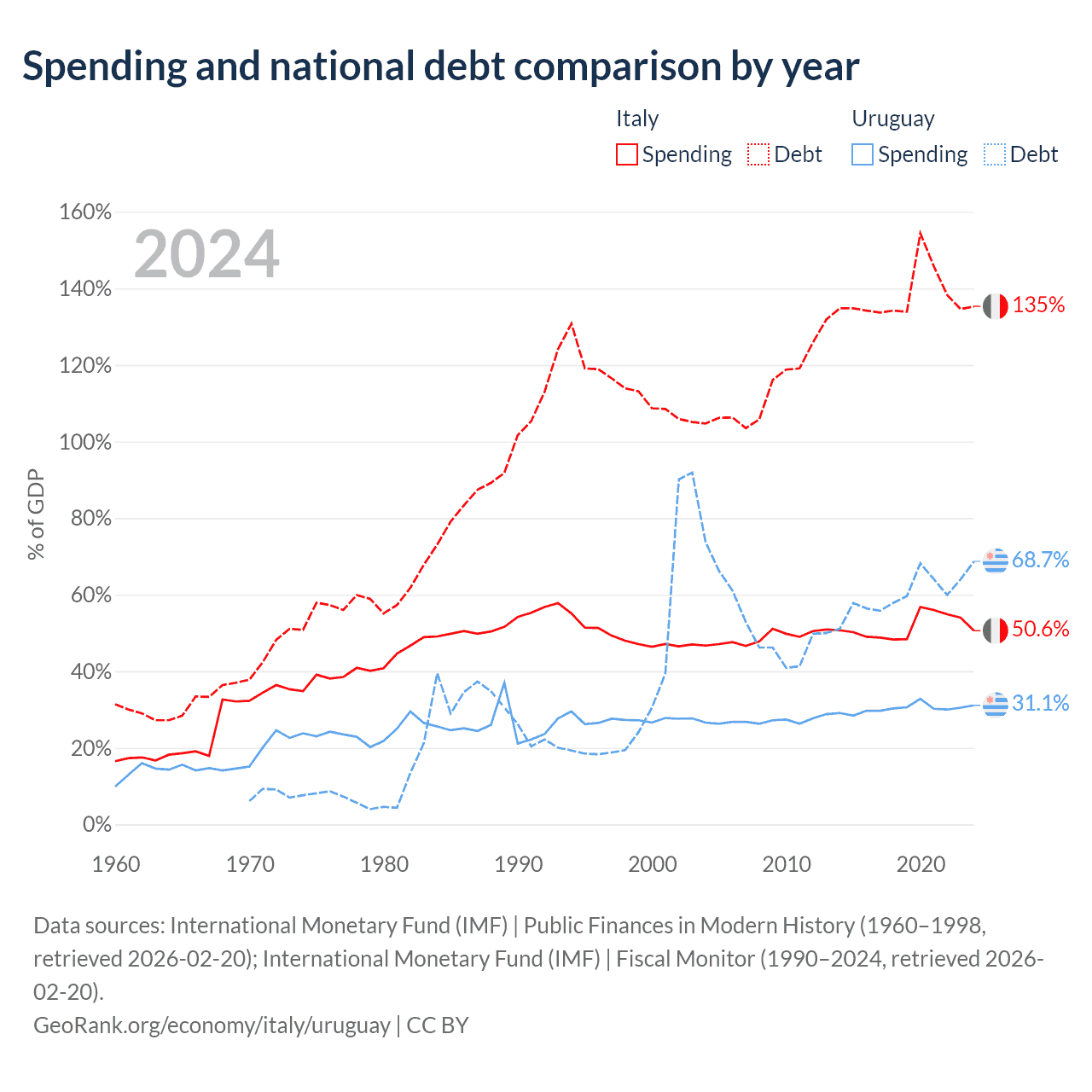 Italy has $3.22T in government debt (138.5% of GDP), compared to $55.6B (68.3% of GDP) in Uruguay.