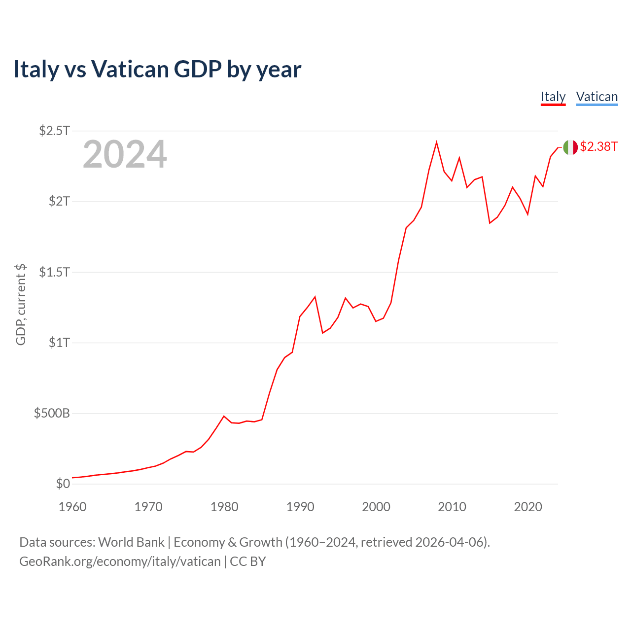 Italy has a GDP of $2.38T compared to $19.8M for the Vatican, ranking 8/197 and 197/197 by economy size, respectively.