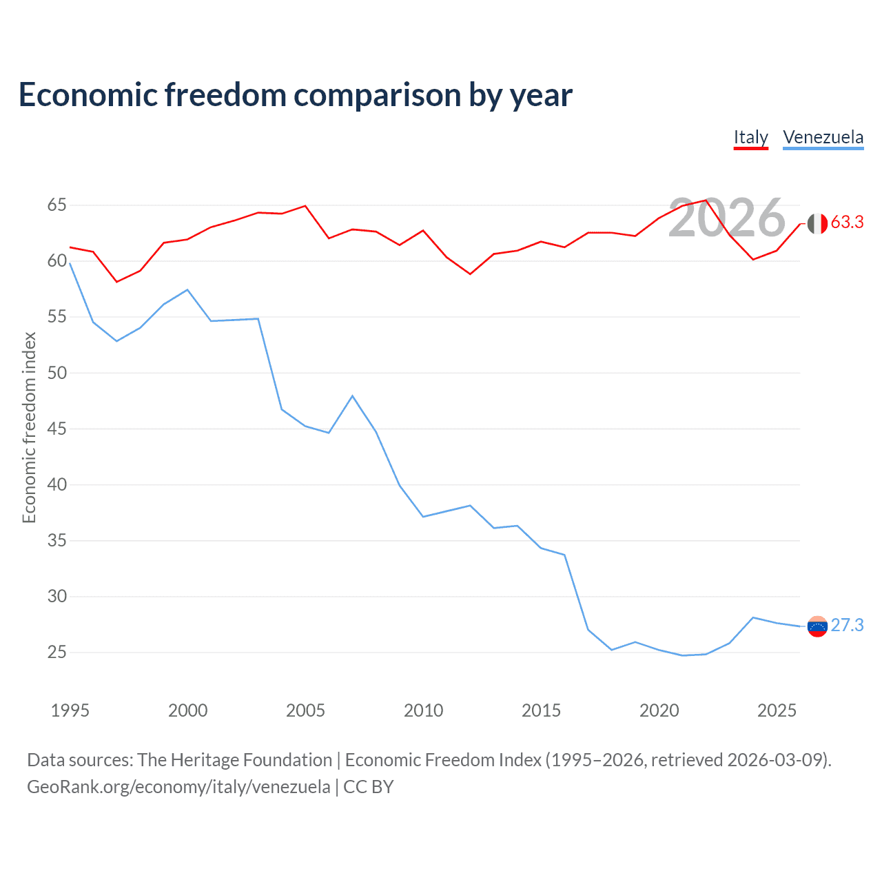 The Economic Freedom Index for Italy is 63.3, ranking 80/197, compared to 27.3 for Venezuela, ranking 194/197. The chart above displays a comparison of annual changes in economic freedom indexes.
