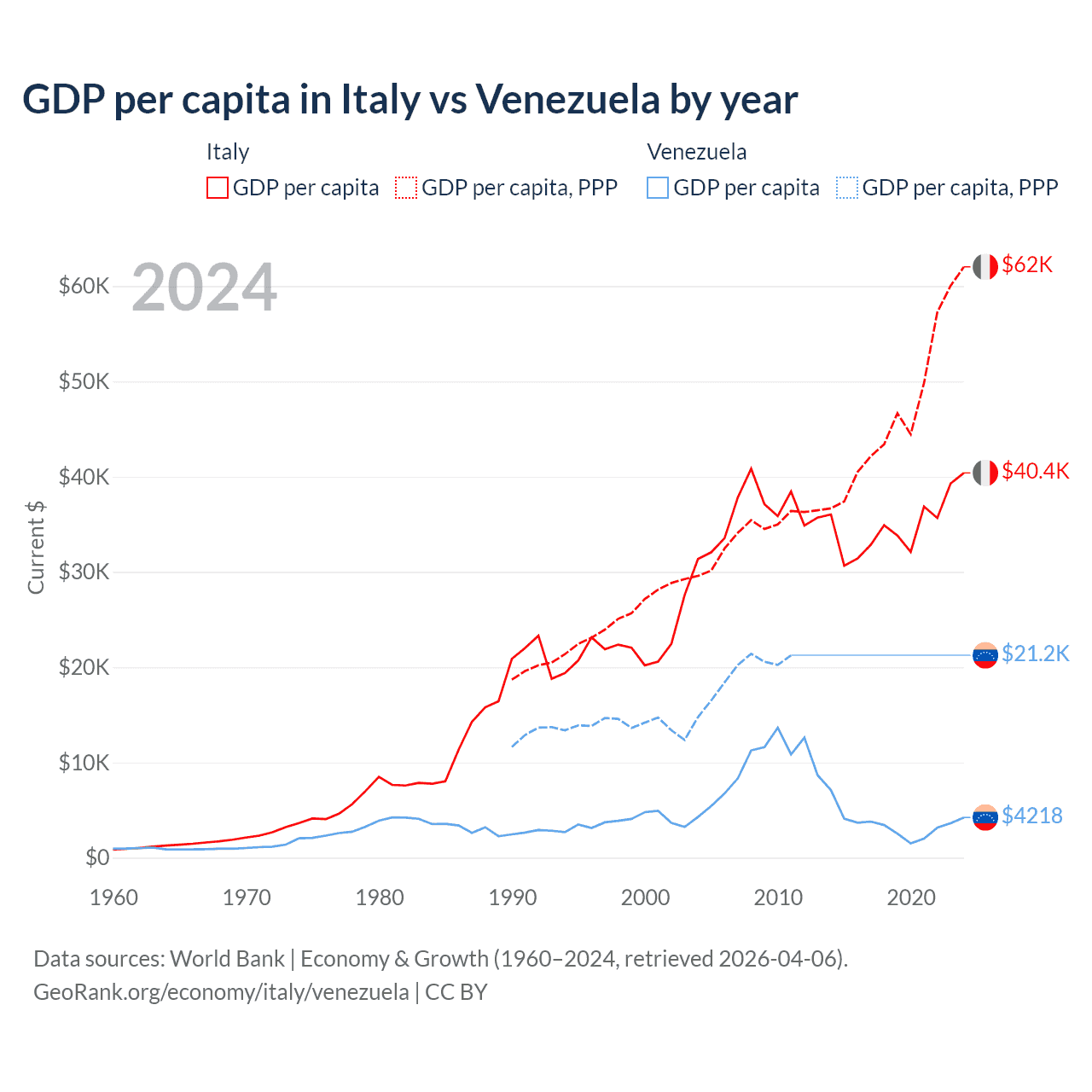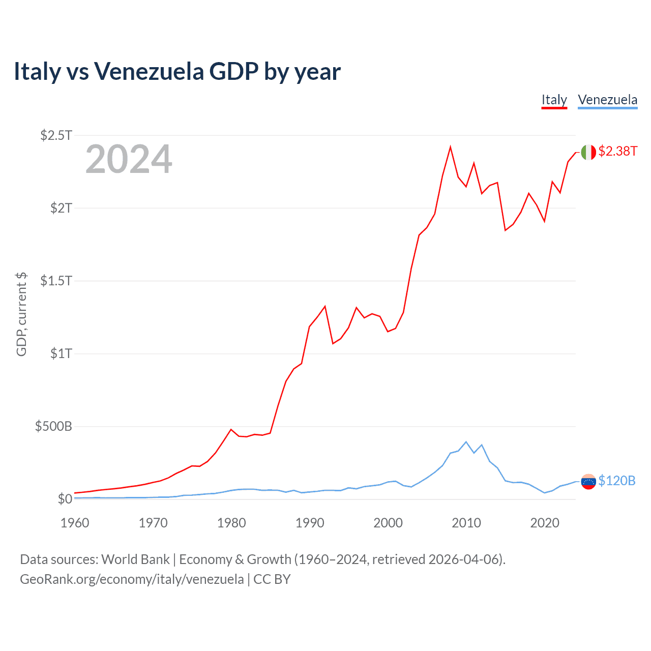 Italy has a GDP of $2.38T compared to $120B for Venezuela, ranking 8/197 and 65/197 by economy size, respectively.