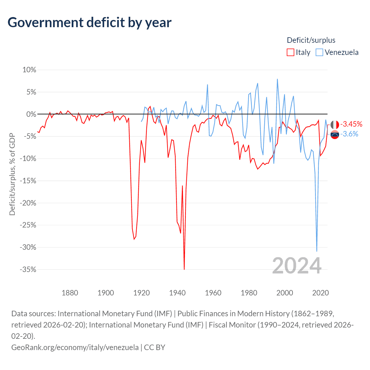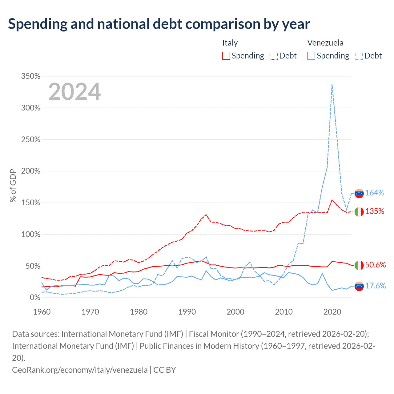 Italy has $3.22T in government debt (135.3% of GDP), compared to $197B (164.3% of GDP) in Venezuela.