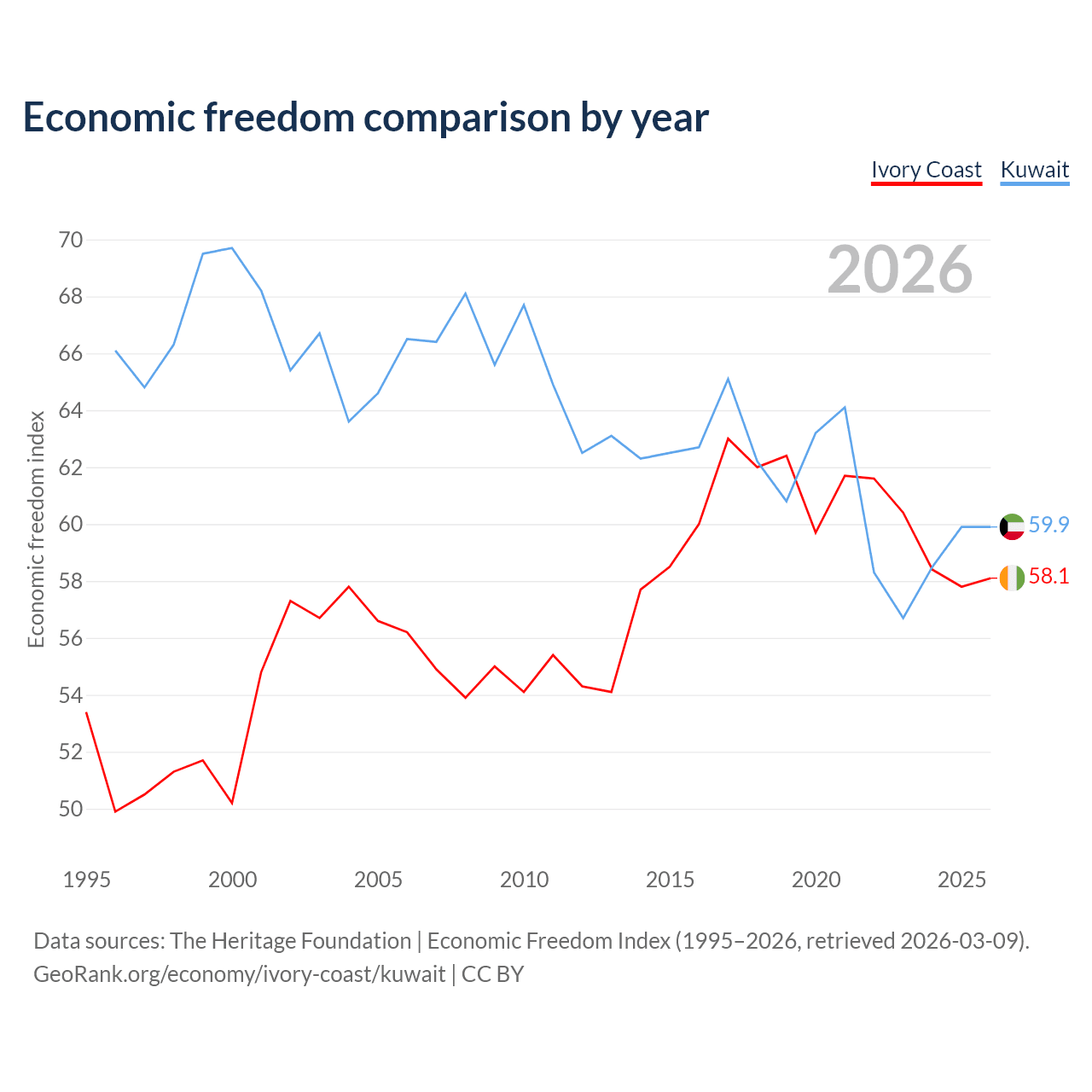 The Economic Freedom Index for Ivory Coast is 58.1, ranking 111/197, compared to 59.9 for Kuwait, ranking 100/197. The chart above displays a comparison of annual changes in economic freedom indexes.