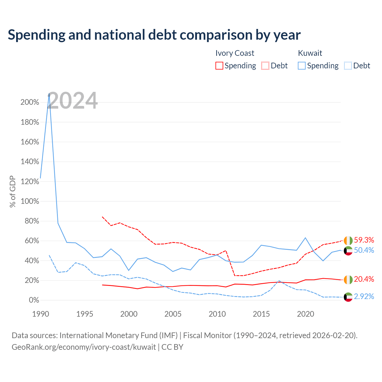 Ivory Coast has $51.6B in government debt (59.3% of GDP), compared to $4.68B (2.92% of GDP) in Kuwait.