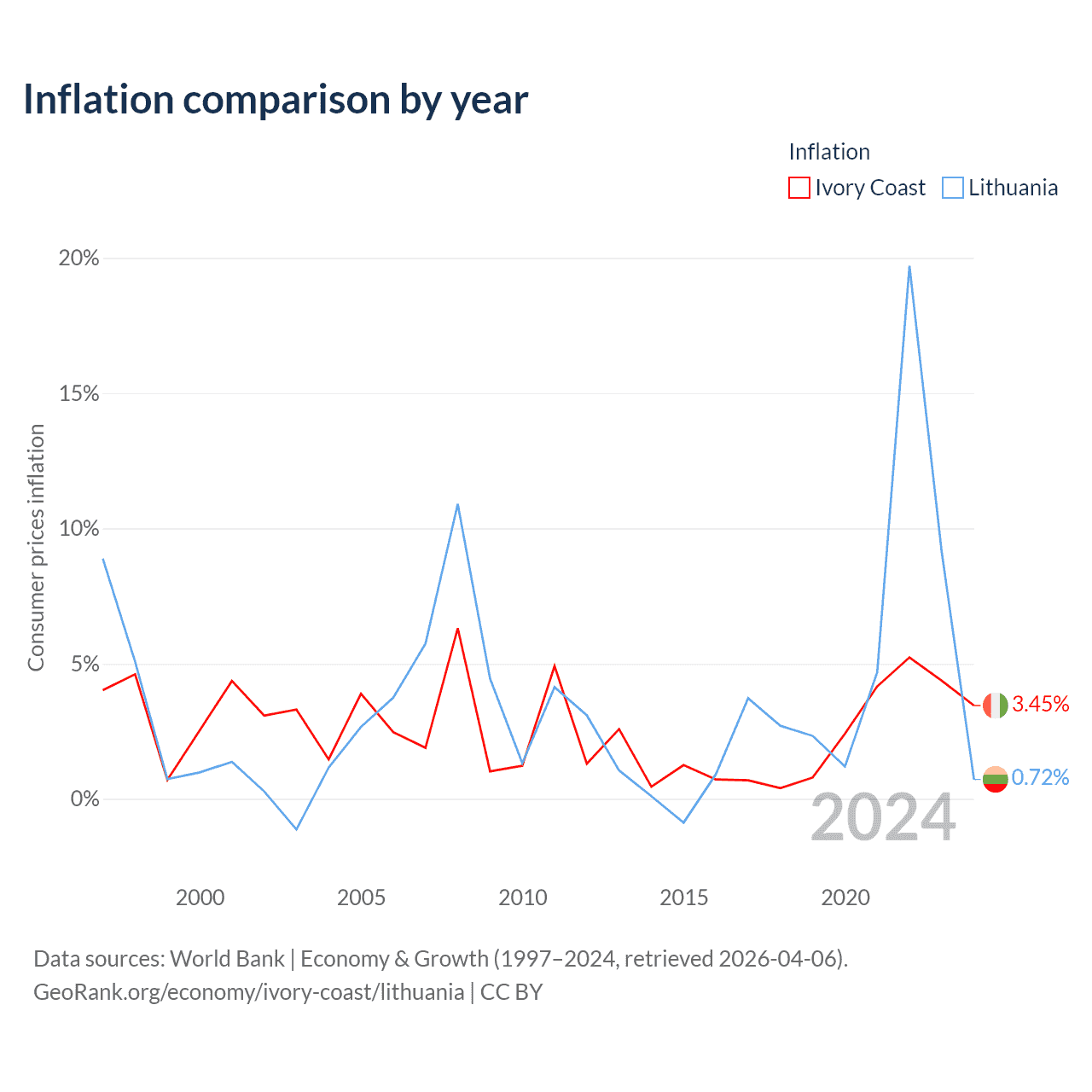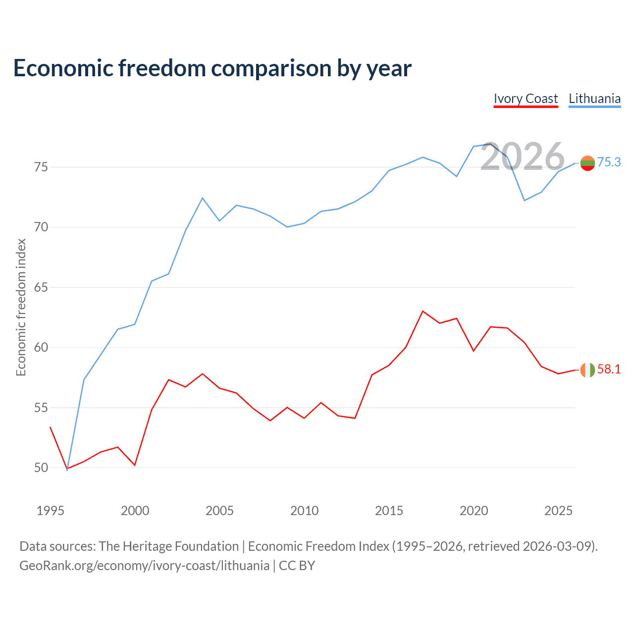 The Economic Freedom Index for Ivory Coast is 58.1, ranking 111/197, compared to 75.3 for Lithuania, ranking 18/197. The chart above displays a comparison of annual changes in economic freedom indexes.