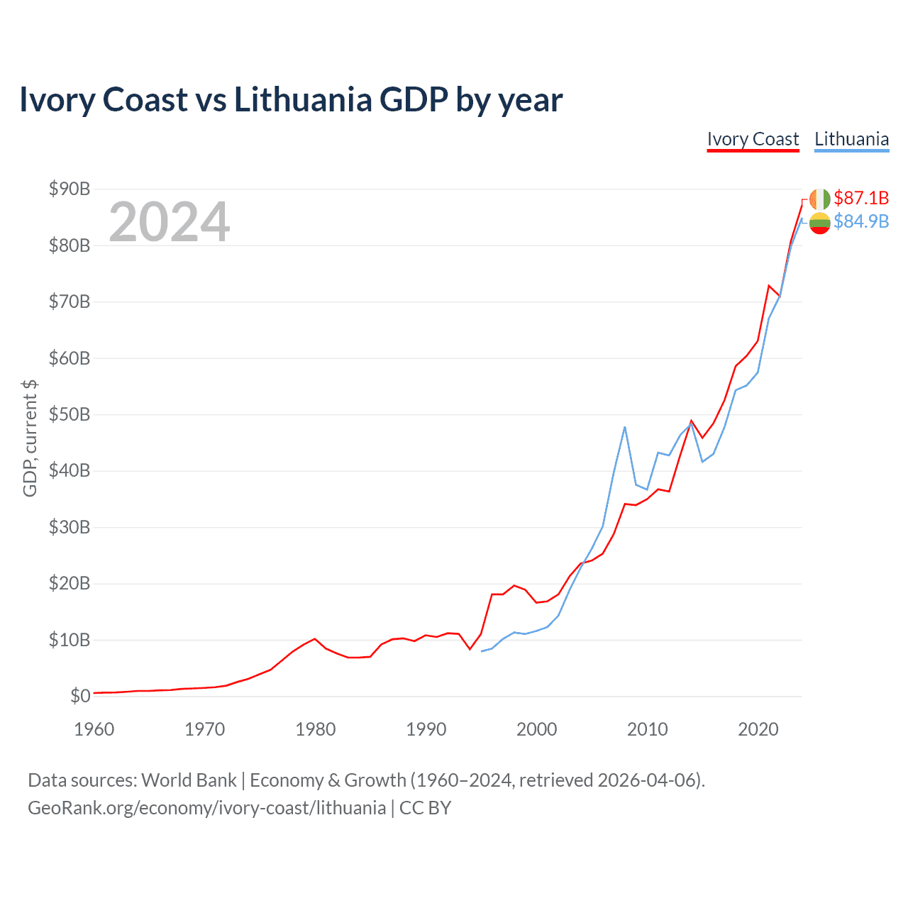 Ivory Coast has a GDP of $87.1B compared to $84.9B for Lithuania, ranking 77/197 and 79/197 by economy size, respectively.