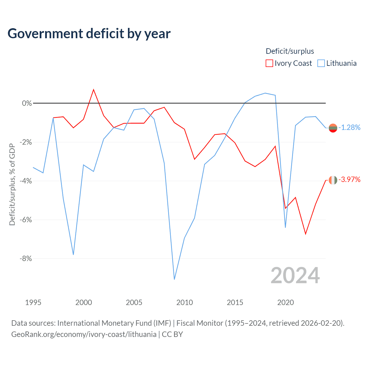 Ivory Coast has $51.6B in government debt (59.3% of GDP), compared to $32.4B (38.2% of GDP) in Lithuania.
