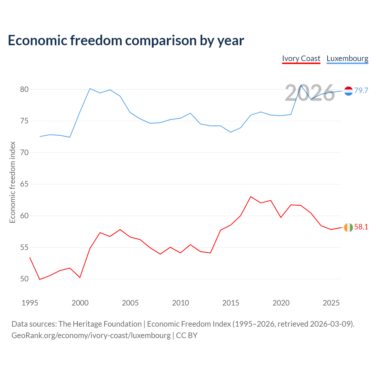 The Economic Freedom Index for Ivory Coast is 58.1, ranking 111/197, compared to 79.7 for Luxembourg, ranking 7/197. The chart above displays a comparison of annual changes in economic freedom indexes.