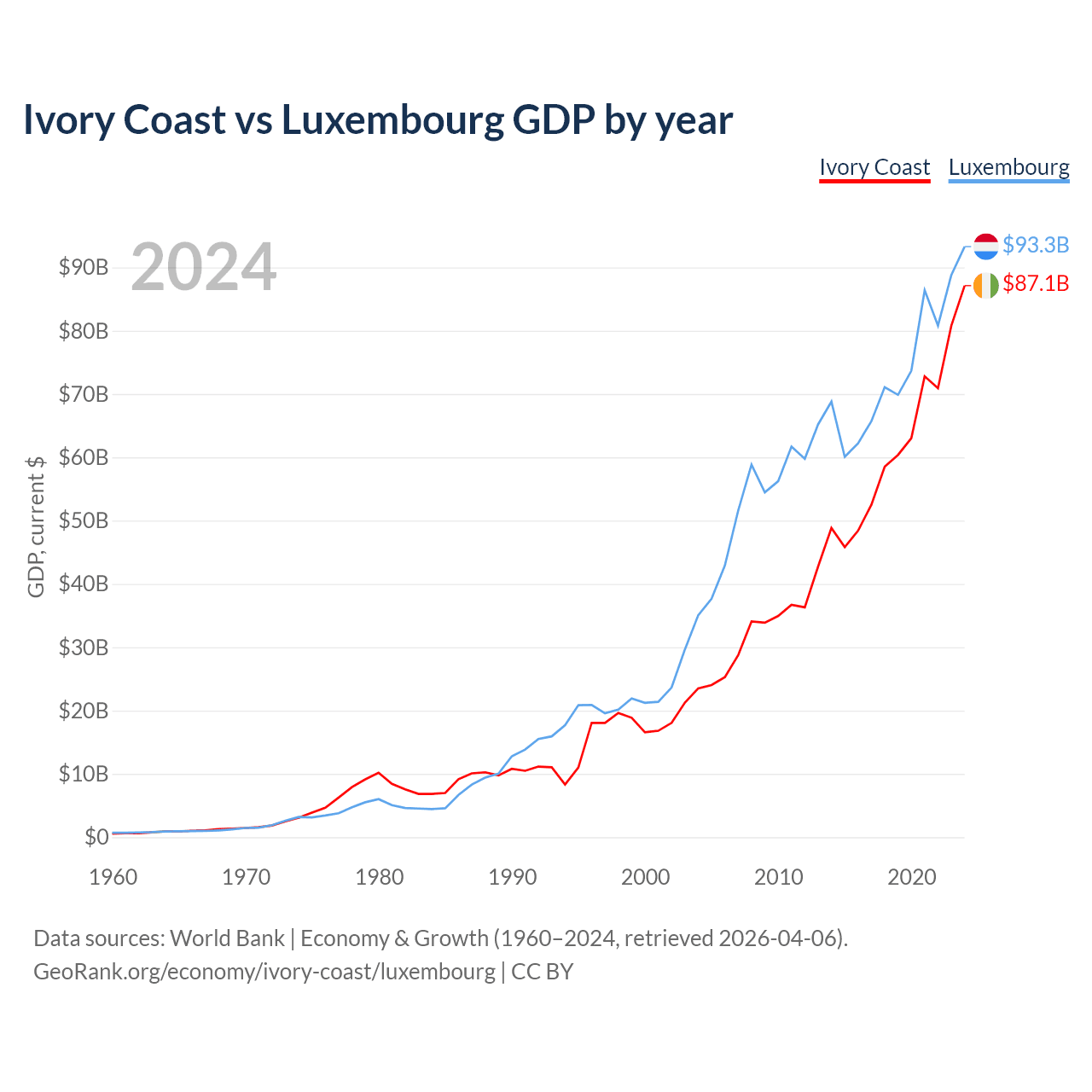 Ivory Coast has a GDP of $87.1B compared to $93.3B for Luxembourg, ranking 77/197 and 74/197 by economy size, respectively.