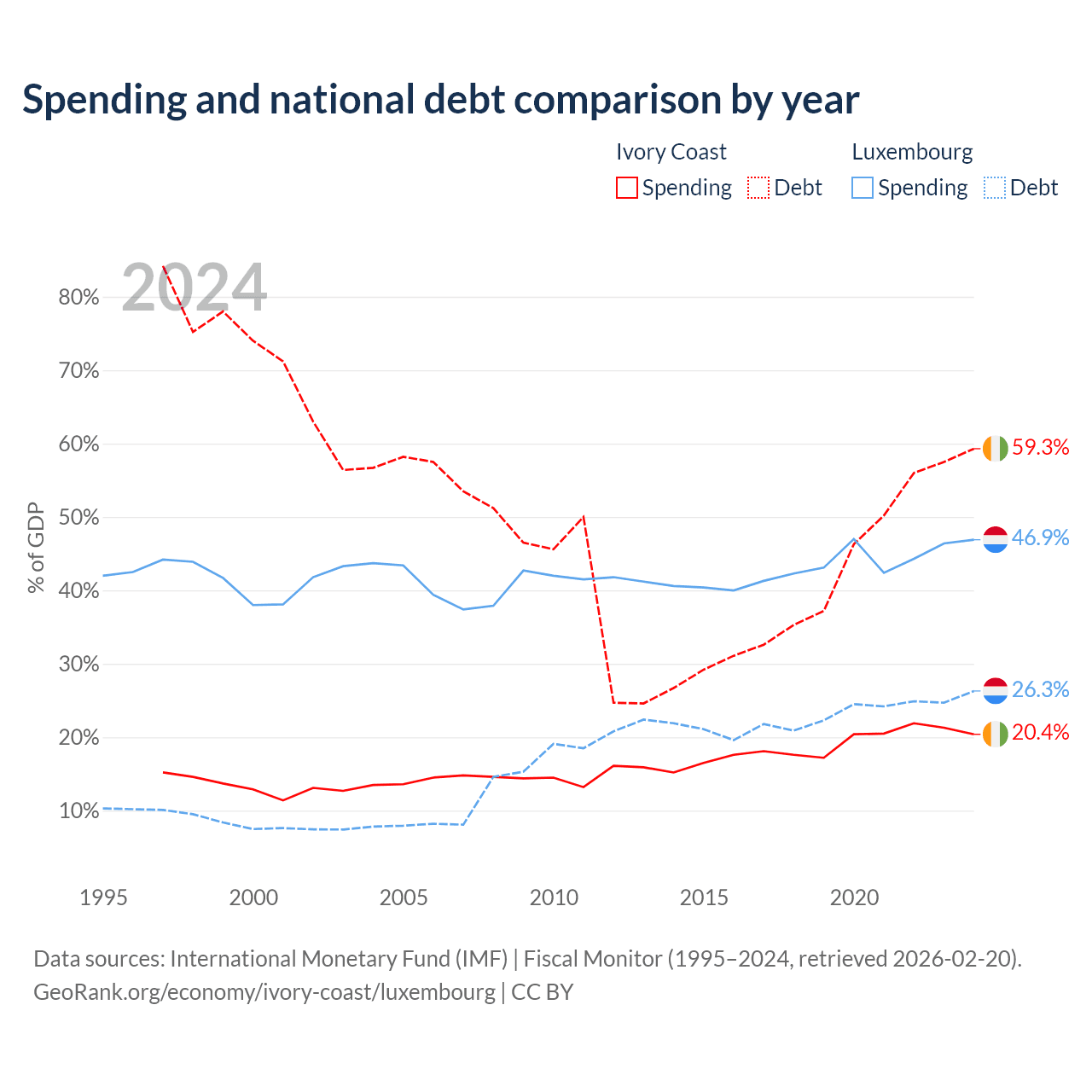 Ivory Coast has $51.6B in government debt (59.3% of GDP), compared to $24.5B (26.3% of GDP) in Luxembourg.