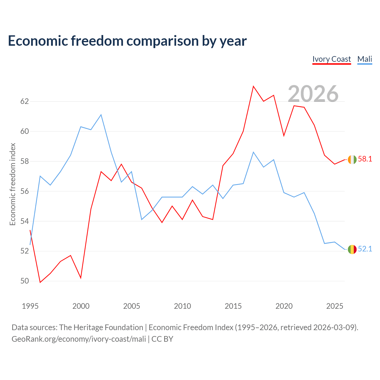 The Economic Freedom Index for Ivory Coast is 58.1, ranking 111/197, compared to 52.1 for Mali, ranking 150/197. The chart above displays a comparison of annual changes in economic freedom indexes.