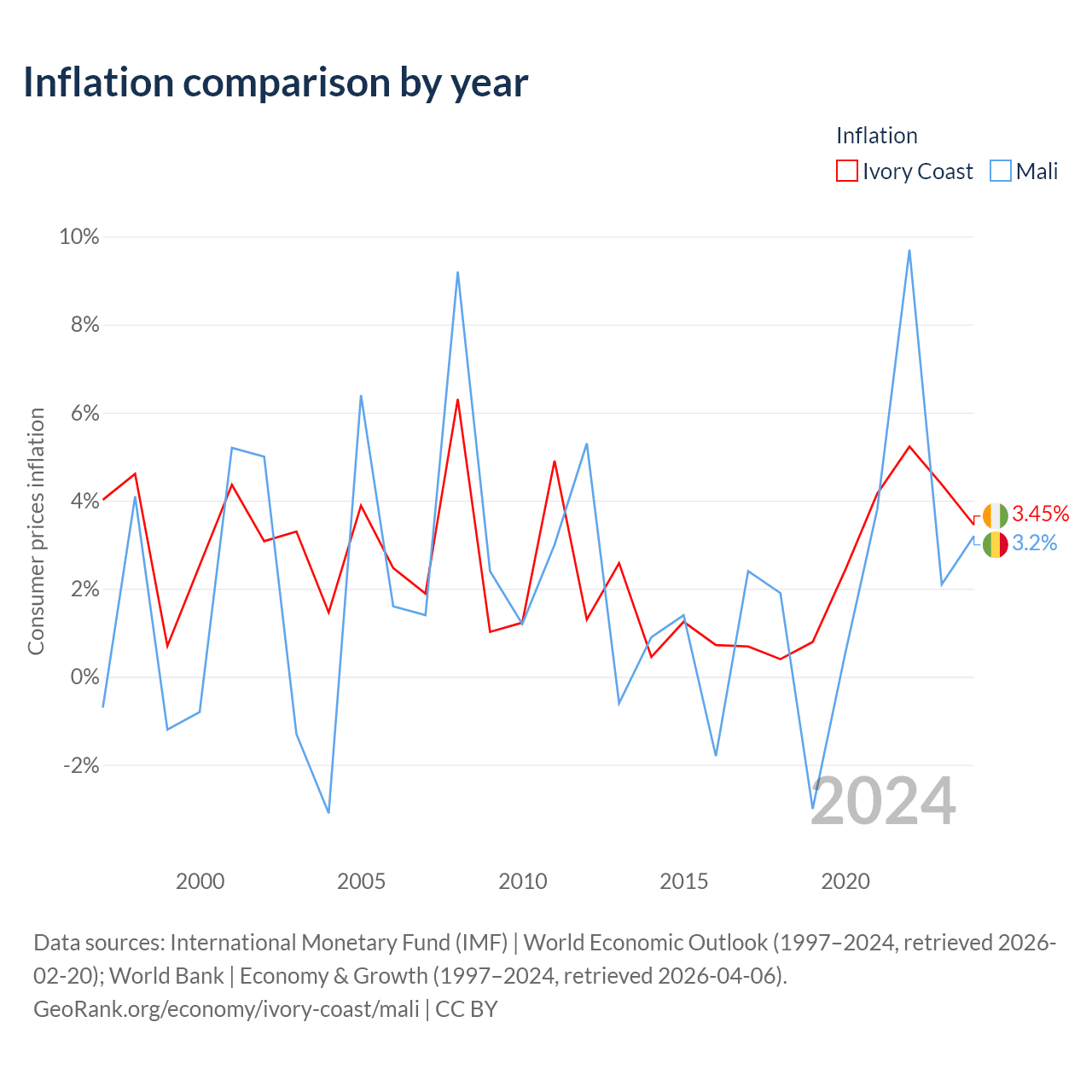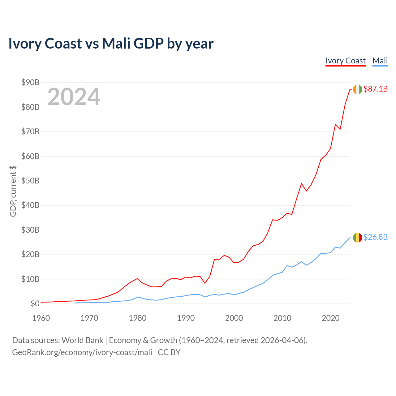 Ivory Coast has a GDP of $87.1B compared to $26.8B for Mali, ranking 77/197 and 113/197 by economy size, respectively.