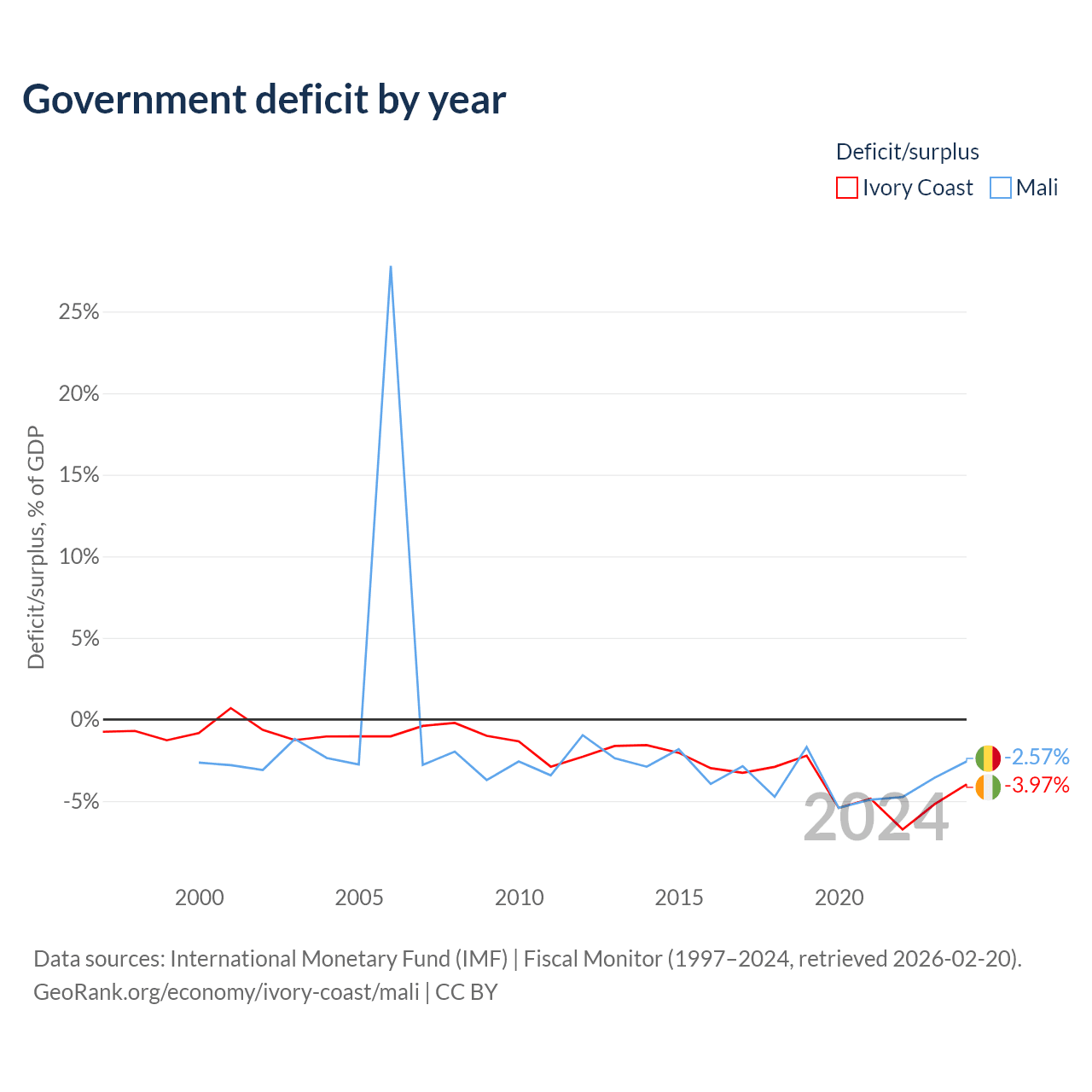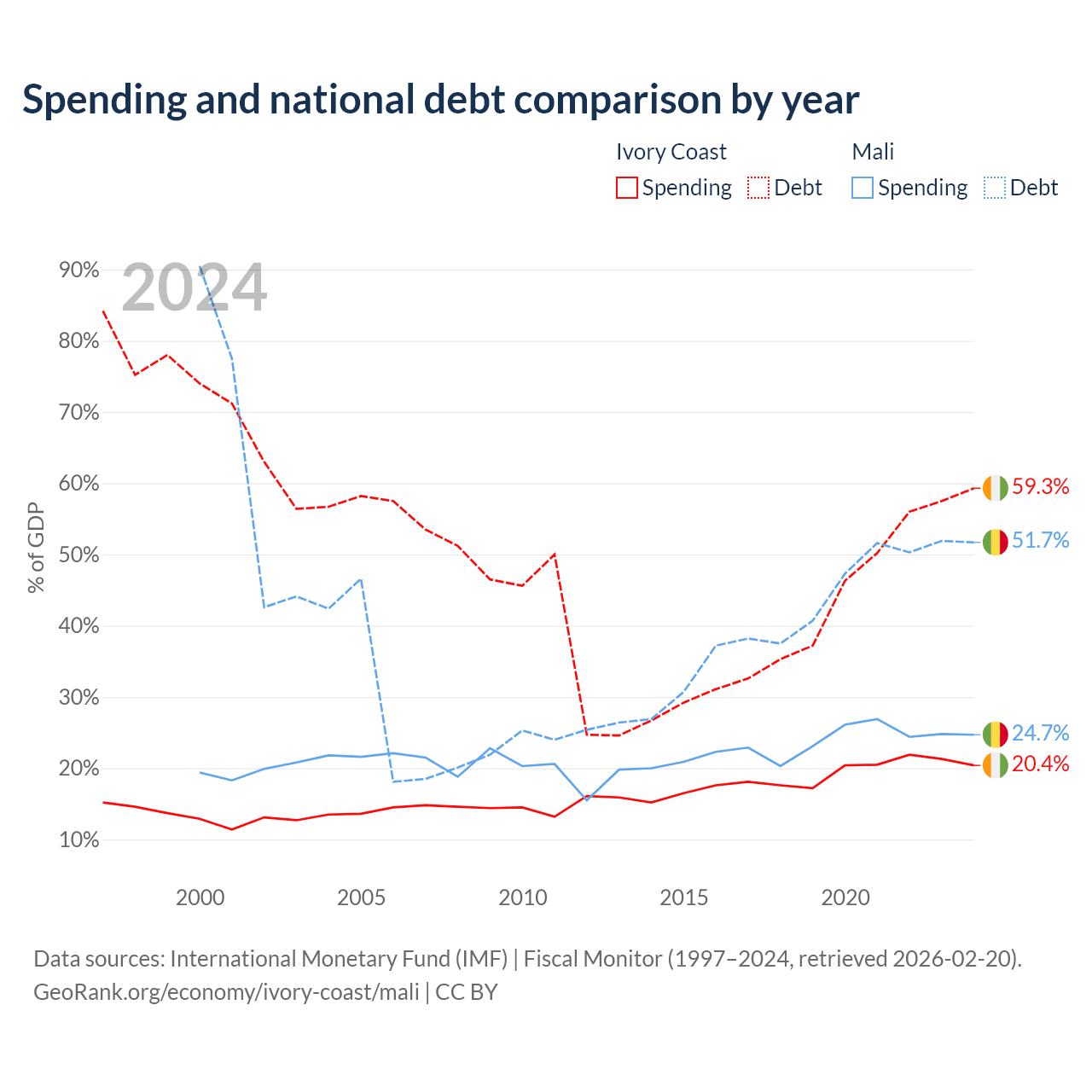 Ivory Coast has $51.6B in government debt (59.3% of GDP), compared to $13.9B (51.7% of GDP) in Mali.