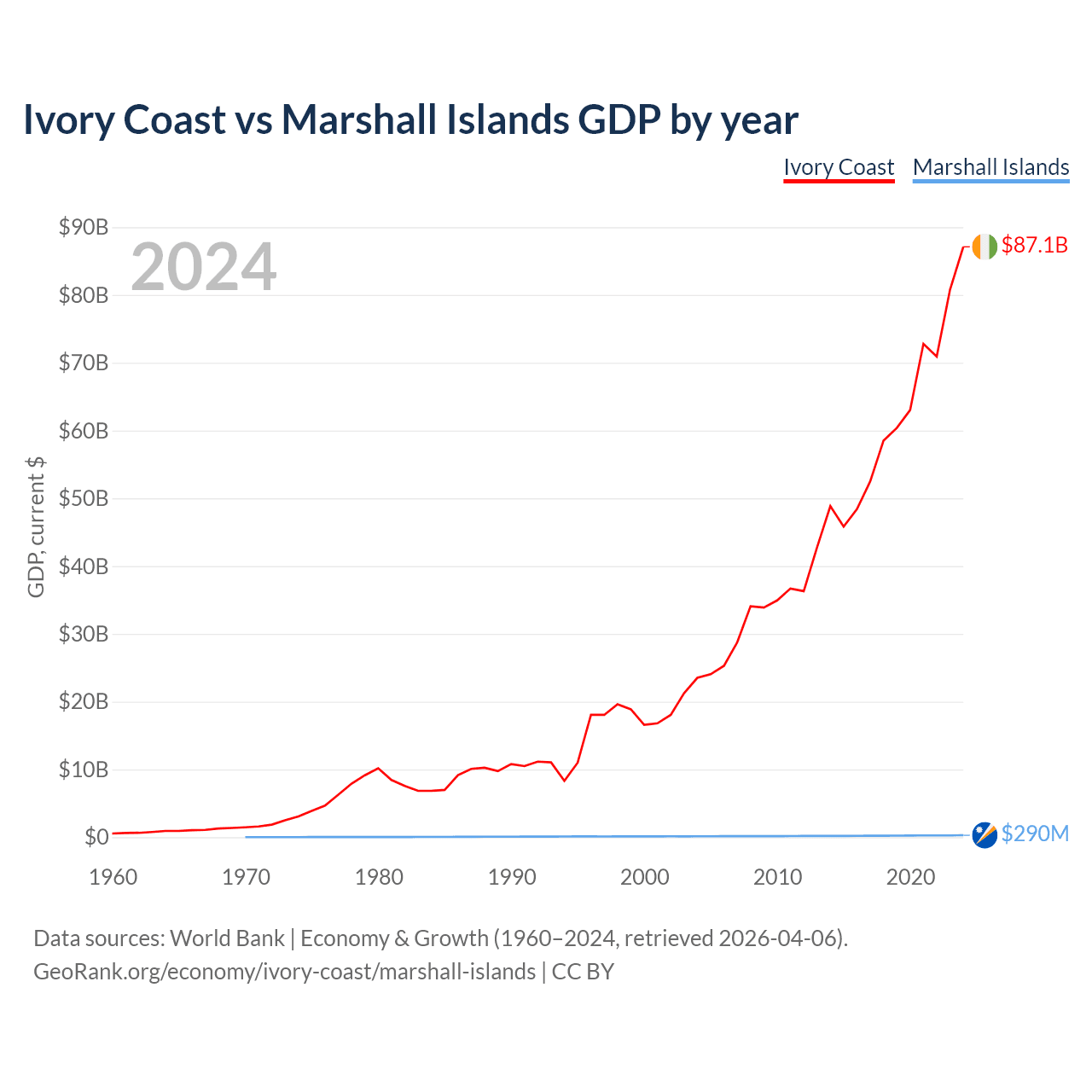 Ivory Coast has a GDP of $87.1B compared to $290M for the Marshall Islands, ranking 77/197 and 193/197 by economy size, respectively.