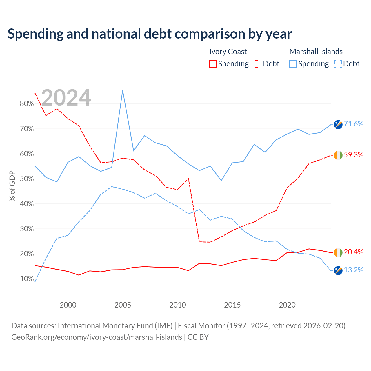 Ivory Coast has $51.6B in government debt (59.3% of GDP), compared to $38.4M (13.2% of GDP) in the Marshall Islands.