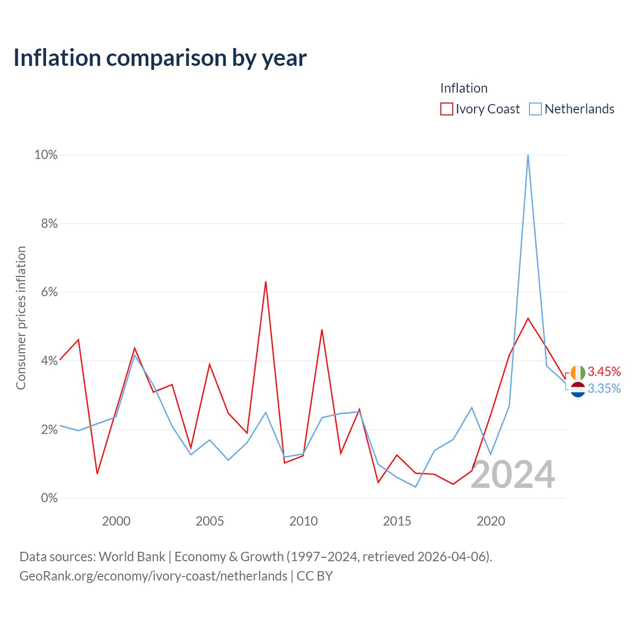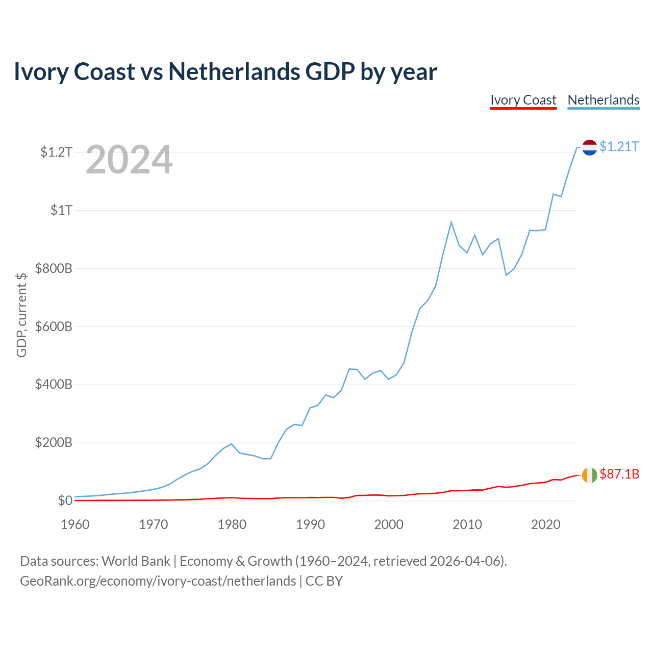 Ivory Coast vs Netherlands GDP by year