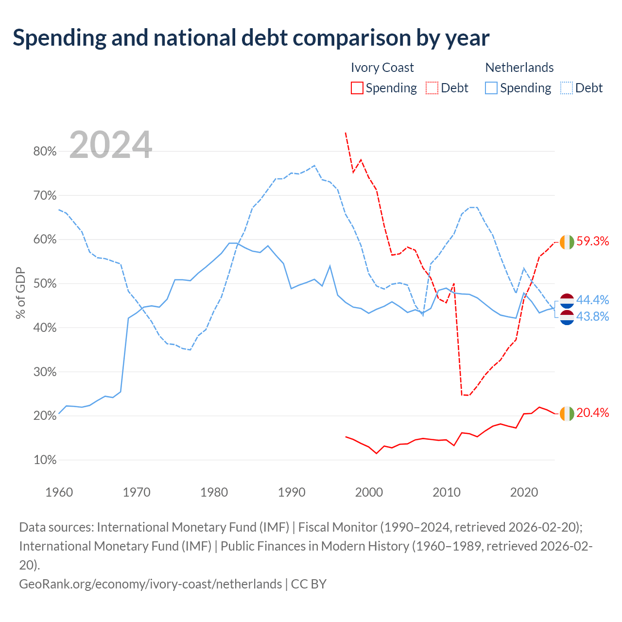 Ivory Coast has $51.6B in government debt (59.3% of GDP), compared to $532B (43.8% of GDP) in the Netherlands.
