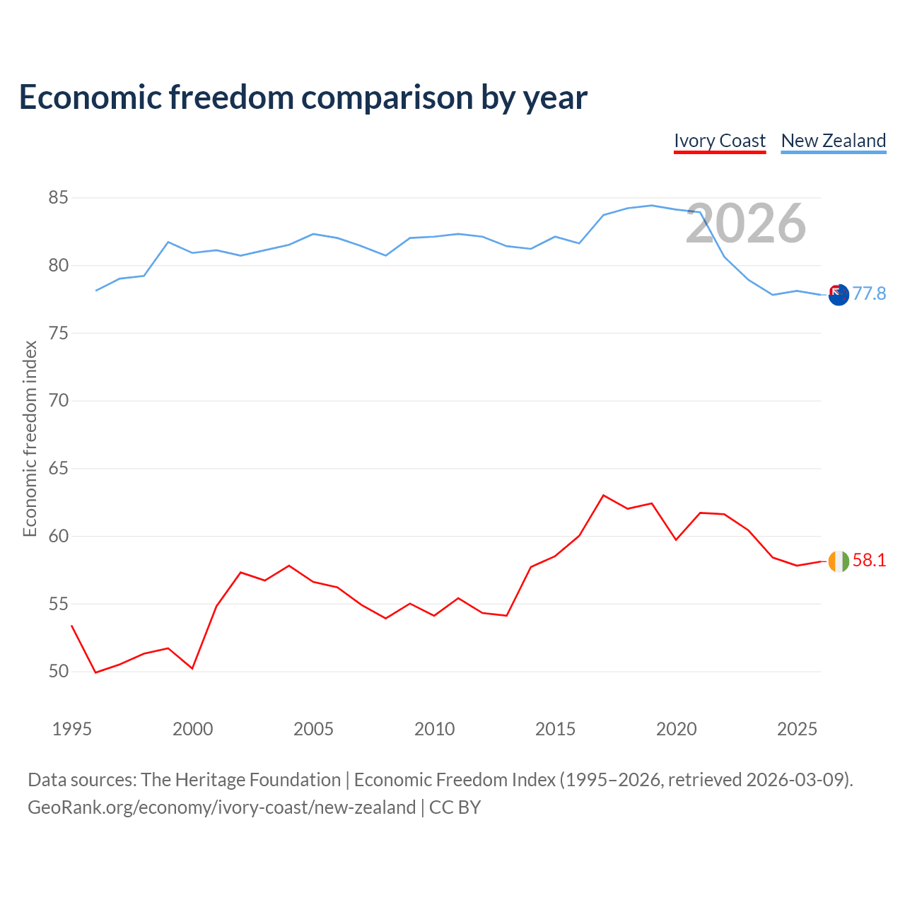 The Economic Freedom Index for Ivory Coast is 58.1, ranking 111/197, compared to 77.8 for New Zealand, ranking 13/197. The chart above displays a comparison of annual changes in economic freedom indexes.