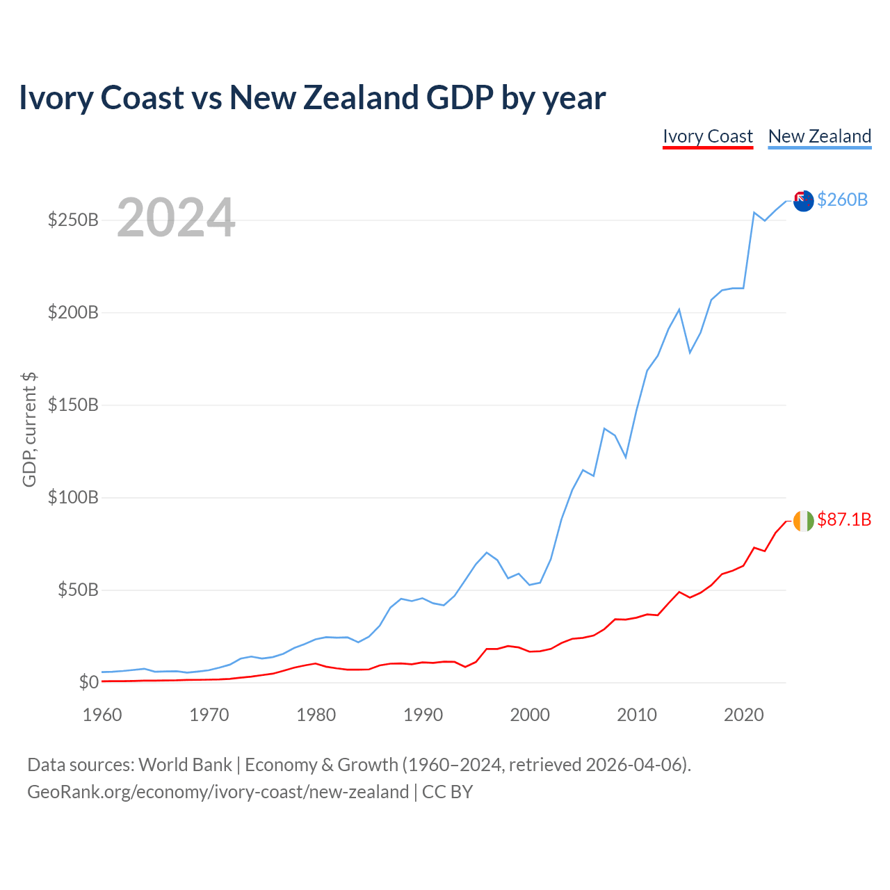 Ivory Coast has a GDP of $87.1B compared to $260B for New Zealand, ranking 77/197 and 52/197 by economy size, respectively.