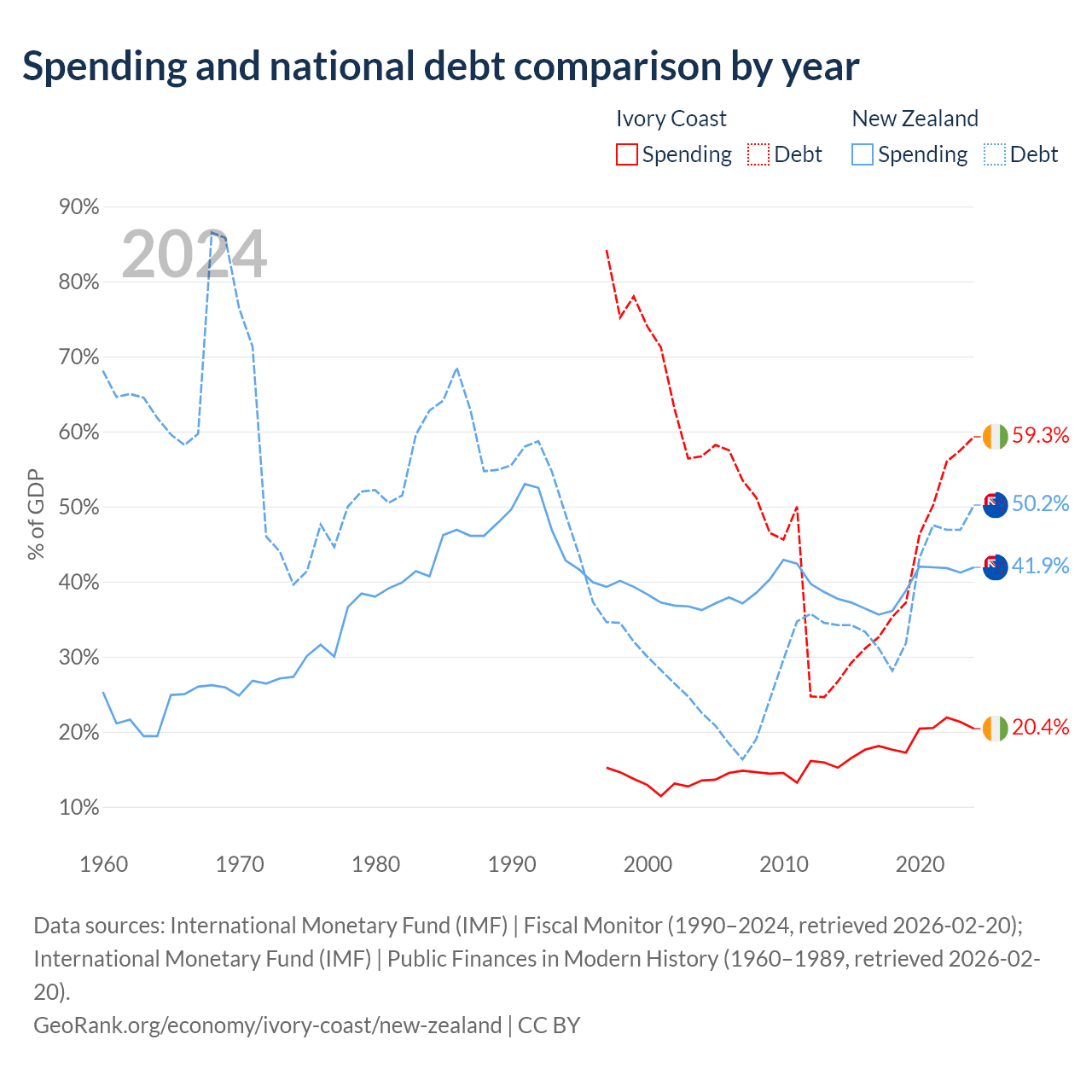 Ivory Coast has $51.6B in government debt (59.3% of GDP), compared to $131B (50.2% of GDP) in New Zealand.