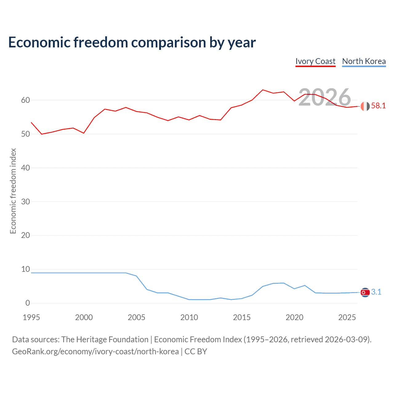 The Economic Freedom Index for Ivory Coast is 58.1, ranking 111/197, compared to 3.1 for North Korea, ranking 197/197. The chart above displays a comparison of annual changes in economic freedom indexes.