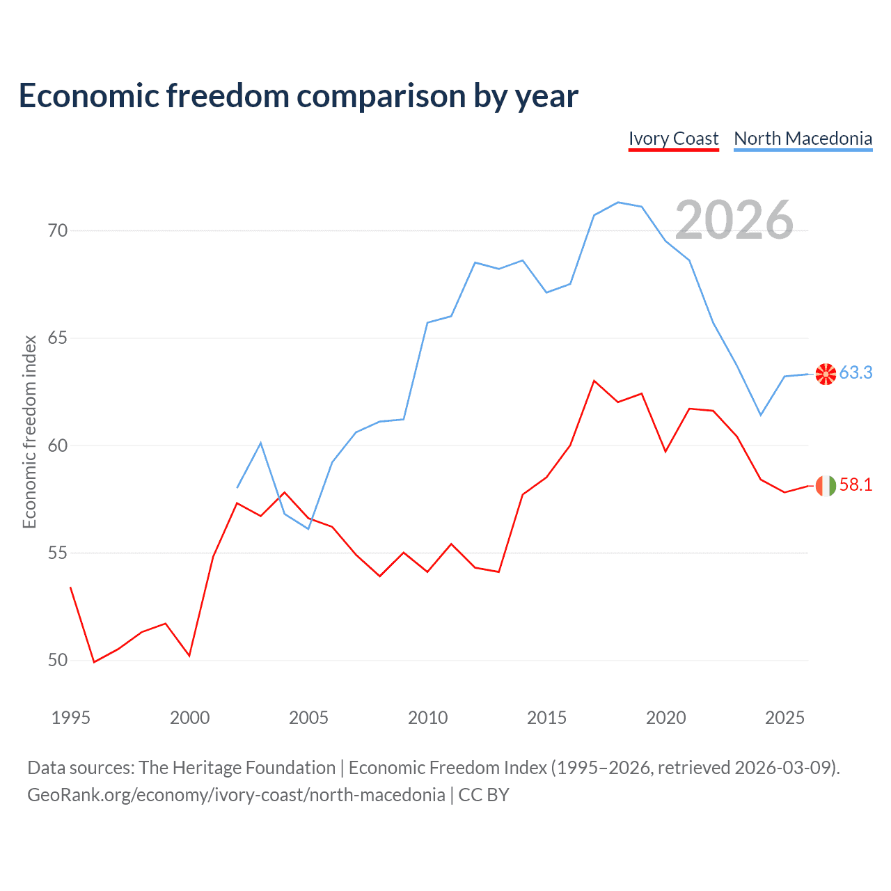 The Economic Freedom Index for Ivory Coast is 58.1, ranking 111/197, compared to 63.3 for North Macedonia, ranking 81/197. The chart above displays a comparison of annual changes in economic freedom indexes.