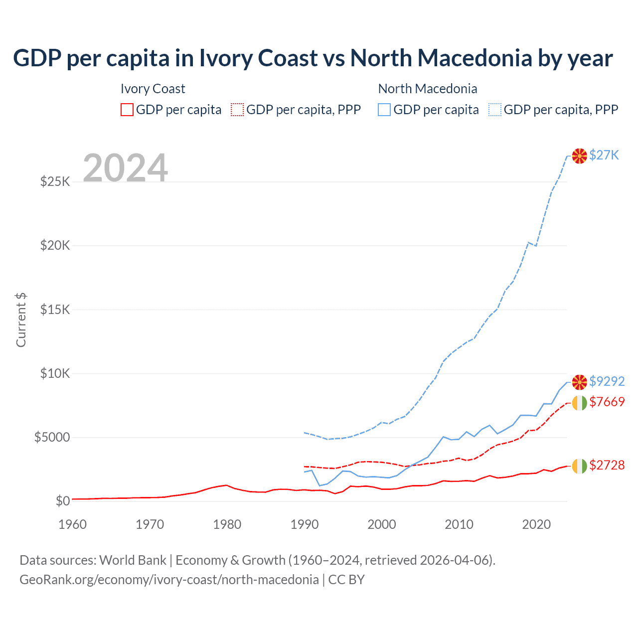 GDP per capita in Ivory Coast vs North Macedonia by year
