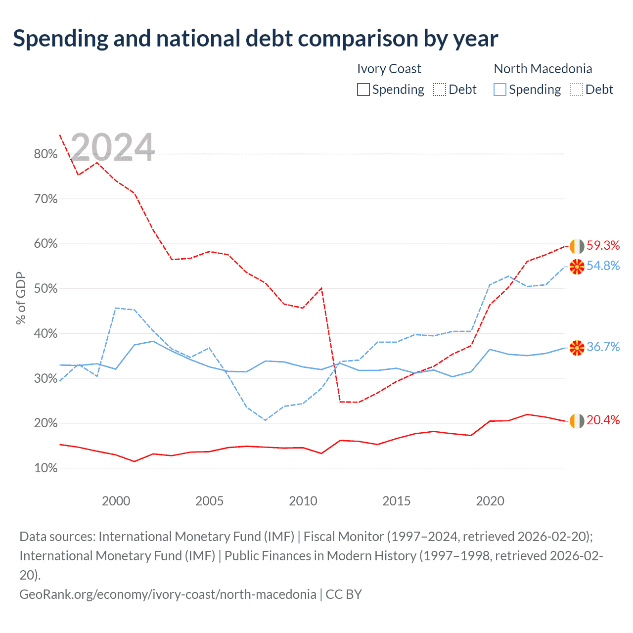 Ivory Coast has $51.6B in government debt (59.3% of GDP), compared to $9.3B (54.8% of GDP) in North Macedonia.