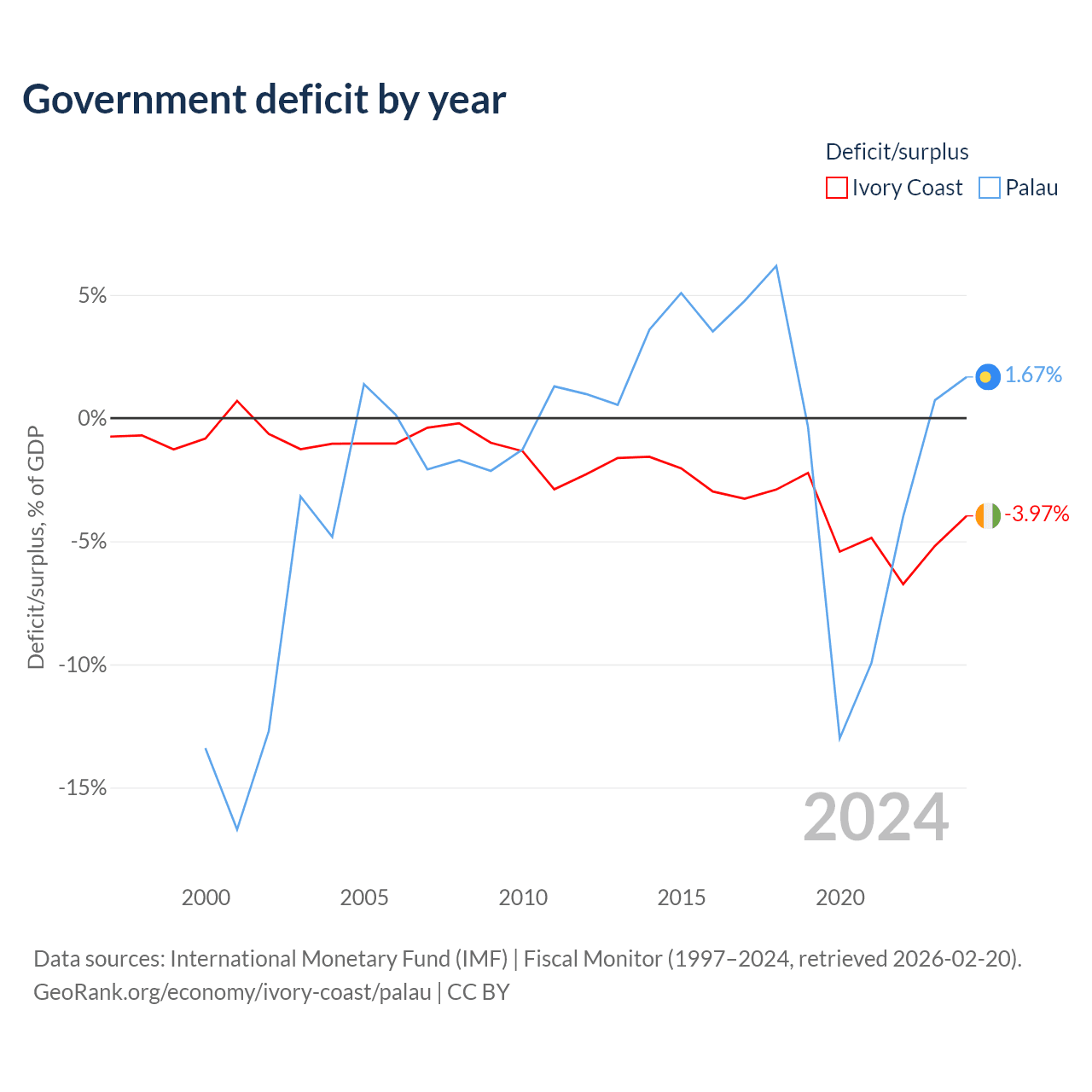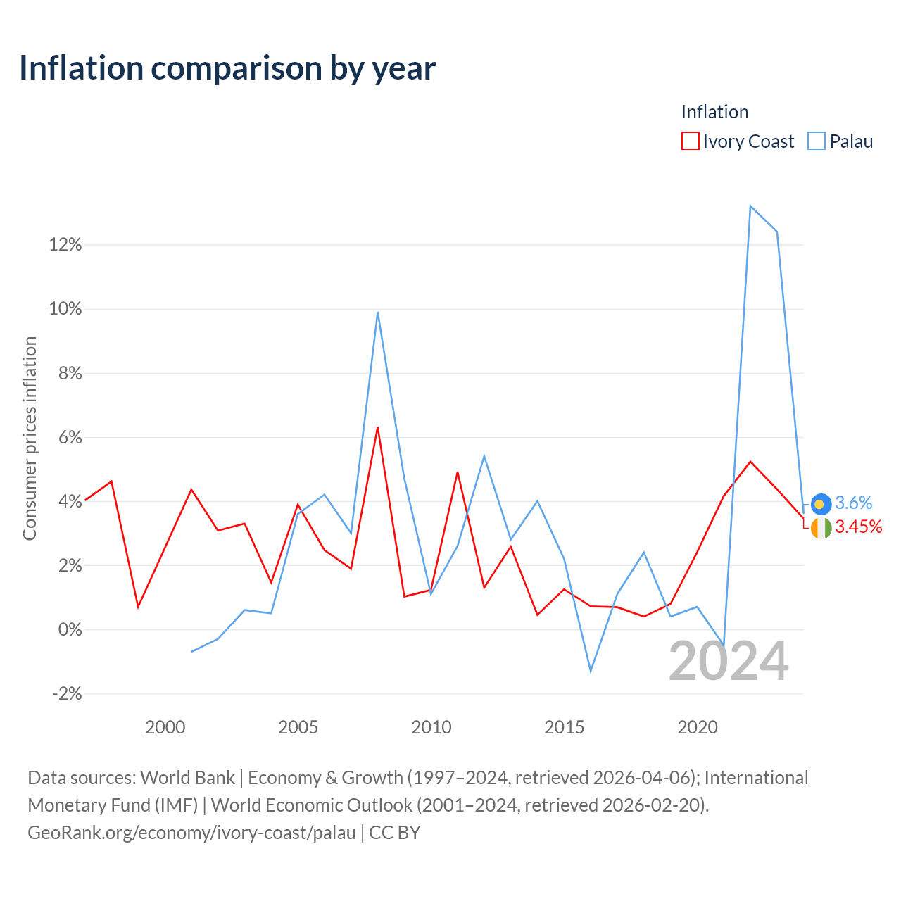 Over the past 24 years, Ivory Coast has recorded an average annual inflation rate of 2.57%, compared with 3.15% in Palau. In 2024, inflation was 3.45% in Ivory Coast and 3.6% in Palau.