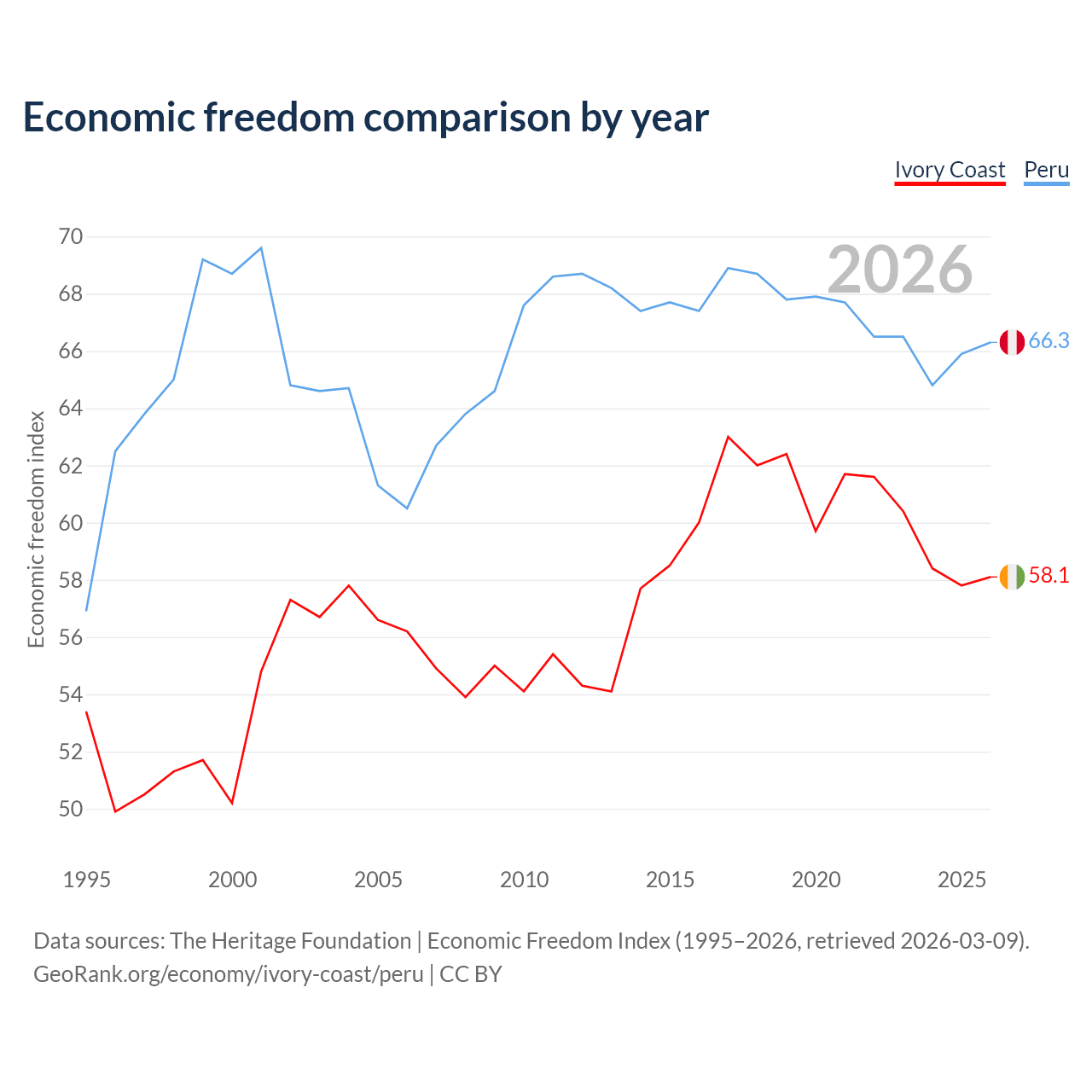 The Economic Freedom Index for Ivory Coast is 58.1, ranking 111/197, compared to 66.3 for Peru, ranking 62/197. The chart above displays a comparison of annual changes in economic freedom indexes.