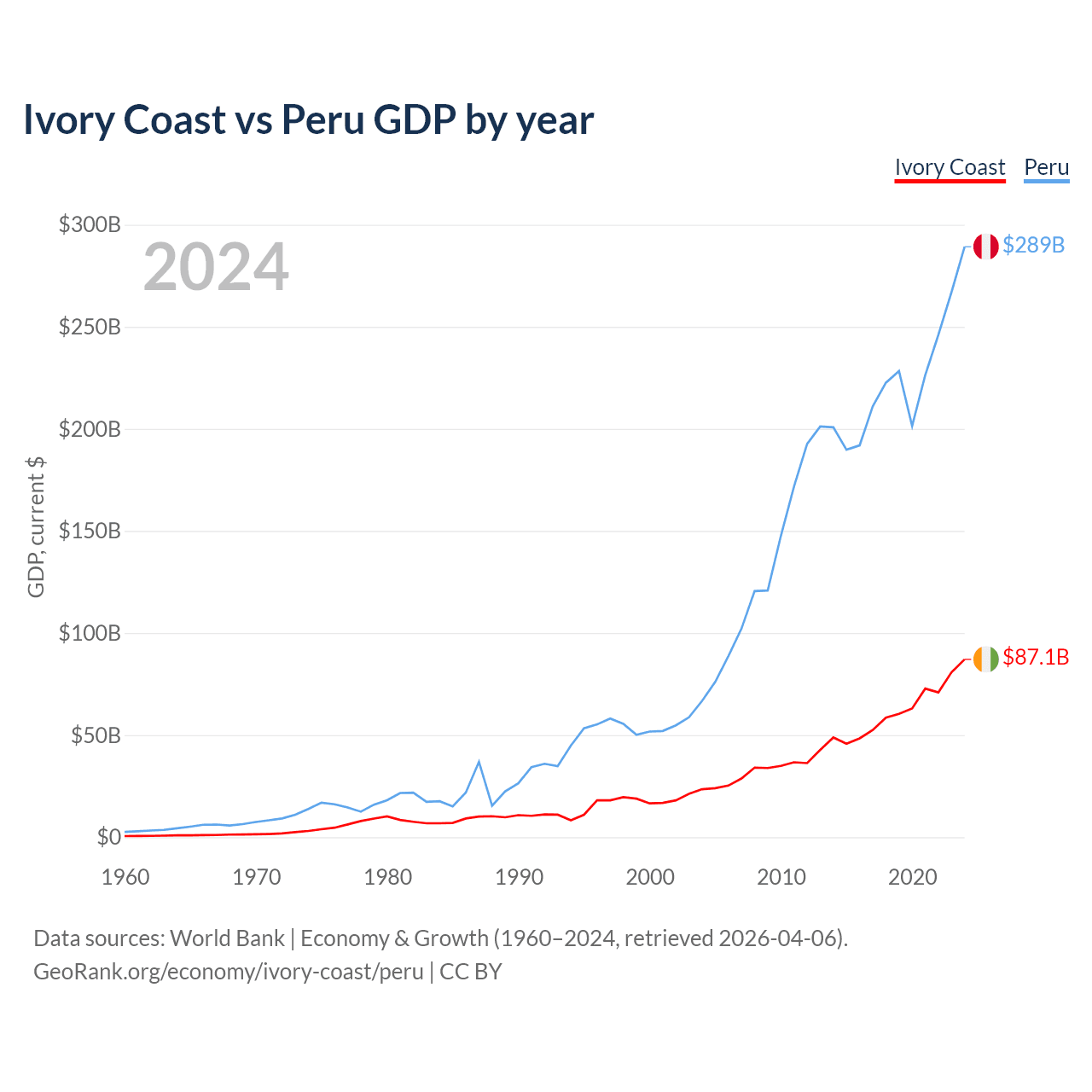 Ivory Coast vs Peru GDP by year