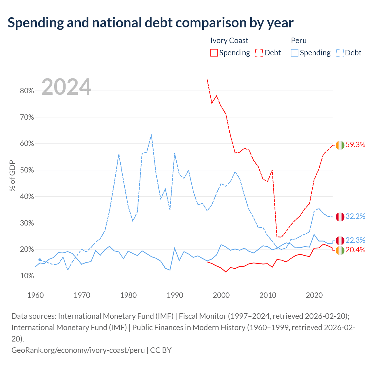 Ivory Coast has $51.6B in government debt (59.3% of GDP), compared to $93B (32.2% of GDP) in Peru.