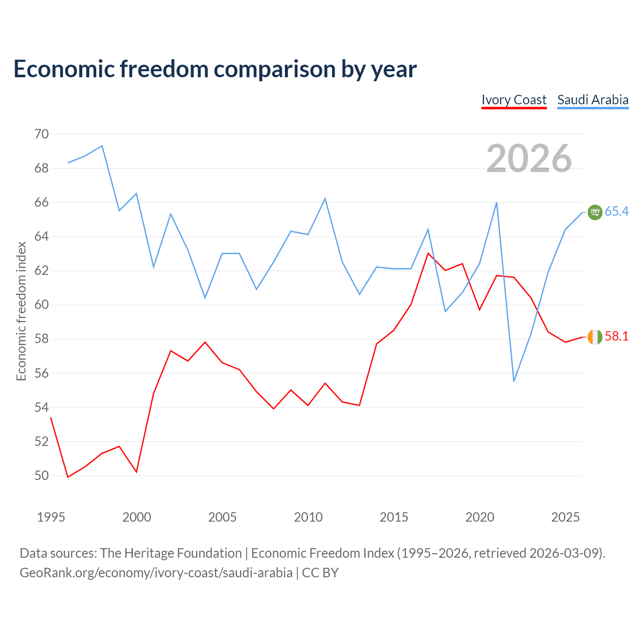 The Economic Freedom Index for Ivory Coast is 58.1, ranking 111/197, compared to 65.4 for Saudi Arabia, ranking 65/197. The chart above displays a comparison of annual changes in economic freedom indexes.