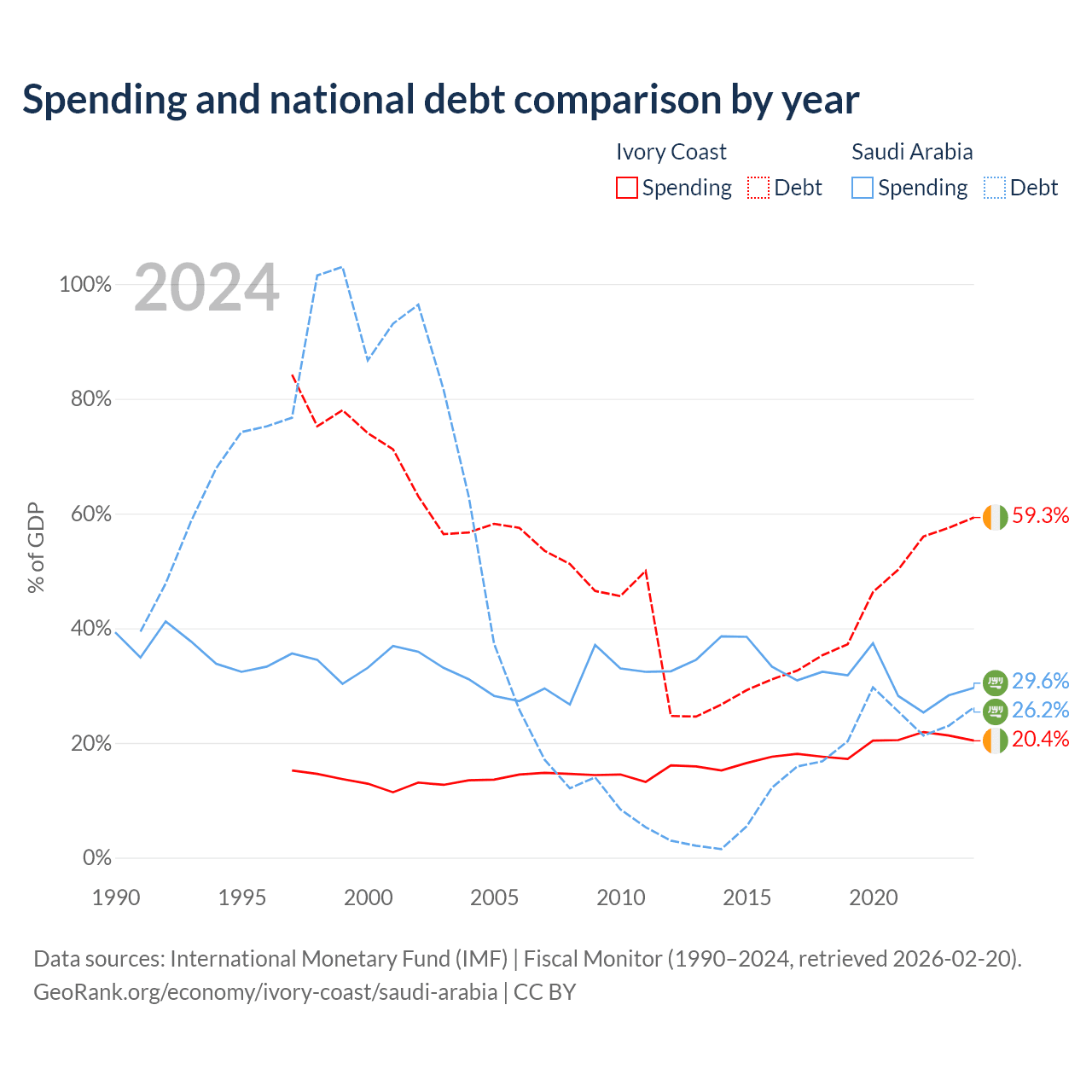 Ivory Coast has $51.6B in government debt (59.3% of GDP), compared to $324B (26.2% of GDP) in Saudi Arabia.
