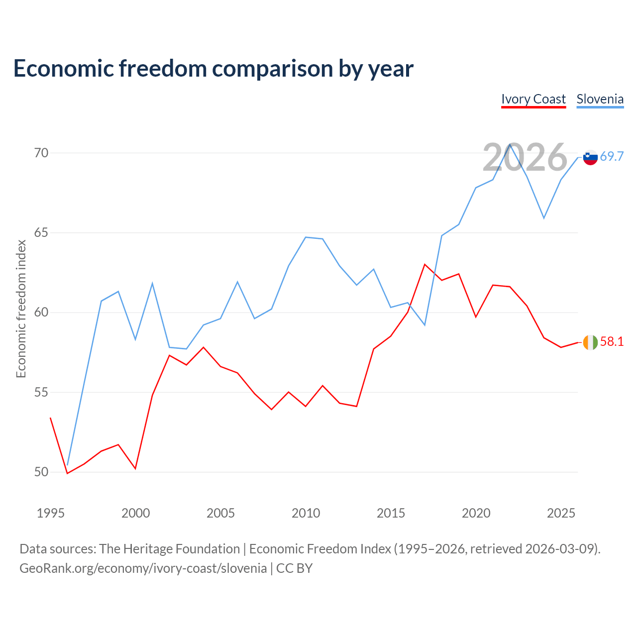 The Economic Freedom Index for Ivory Coast is 58.1, ranking 111/197, compared to 69.7 for Slovenia, ranking 40/197. The chart above displays a comparison of annual changes in economic freedom indexes.